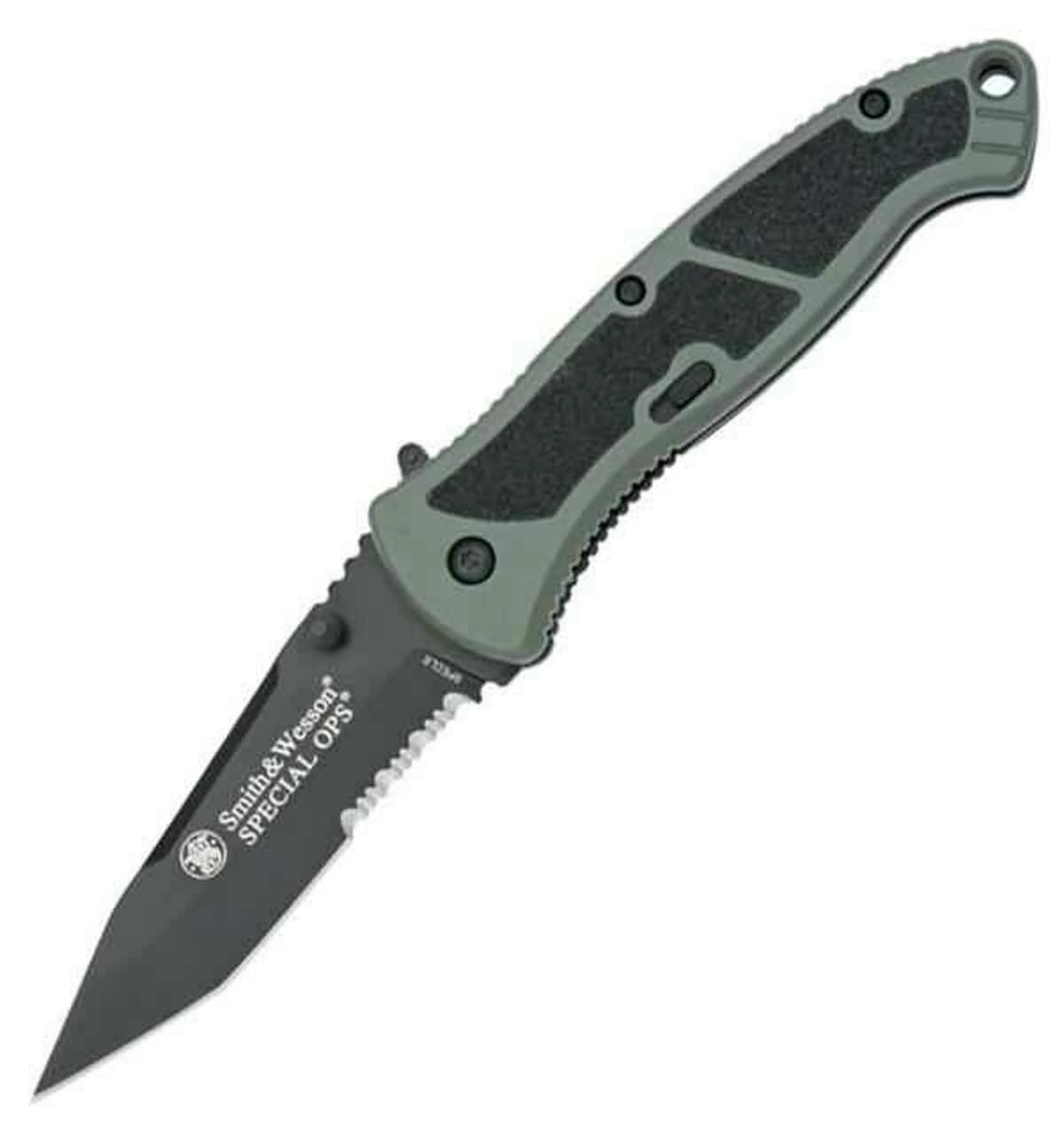S&W Special Ops Linerlock. Large Speed Assisted Linerlock. 4 7/8″ closed. Stainless partially serrated tanto blade with black finish and dual thumb studs. Extended tang. Safety lock in handle locks blade in open or closed position. OD green anodized metal handles with textured black inserts. Black finish stainless pocket clip.