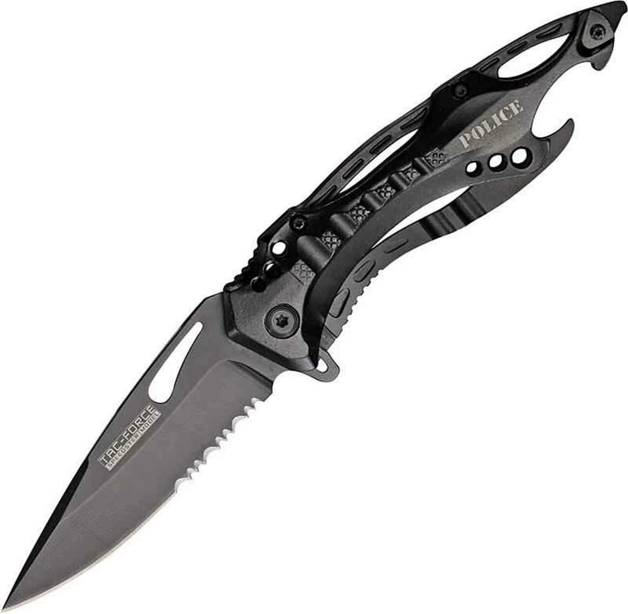 Black finish stainless assisted opening partially serrated drop point blade with thumb slot and extended tang with lashing hole. Black finish block style grooved aluminum handles with drilled hole design, “Police” stamp, integrated bottle opener and glass breaker. Dual lanyard slot on spine. Stainless pocket clip with slot cutout design.
