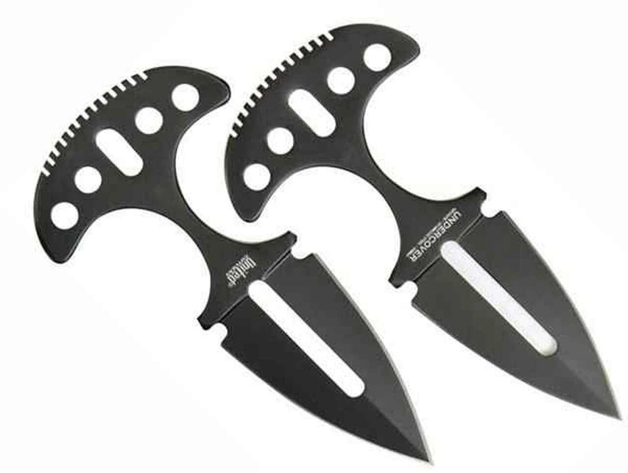 United Undercover Push Daggers Twin Push Daggers. One piece black finish 420J2 stainless construction. 3 3/4″ overall. 2 1/8″ double edge blade with center slot cutout. Black molded Kydex sheath with adjustable black nylon arm/leg straps.