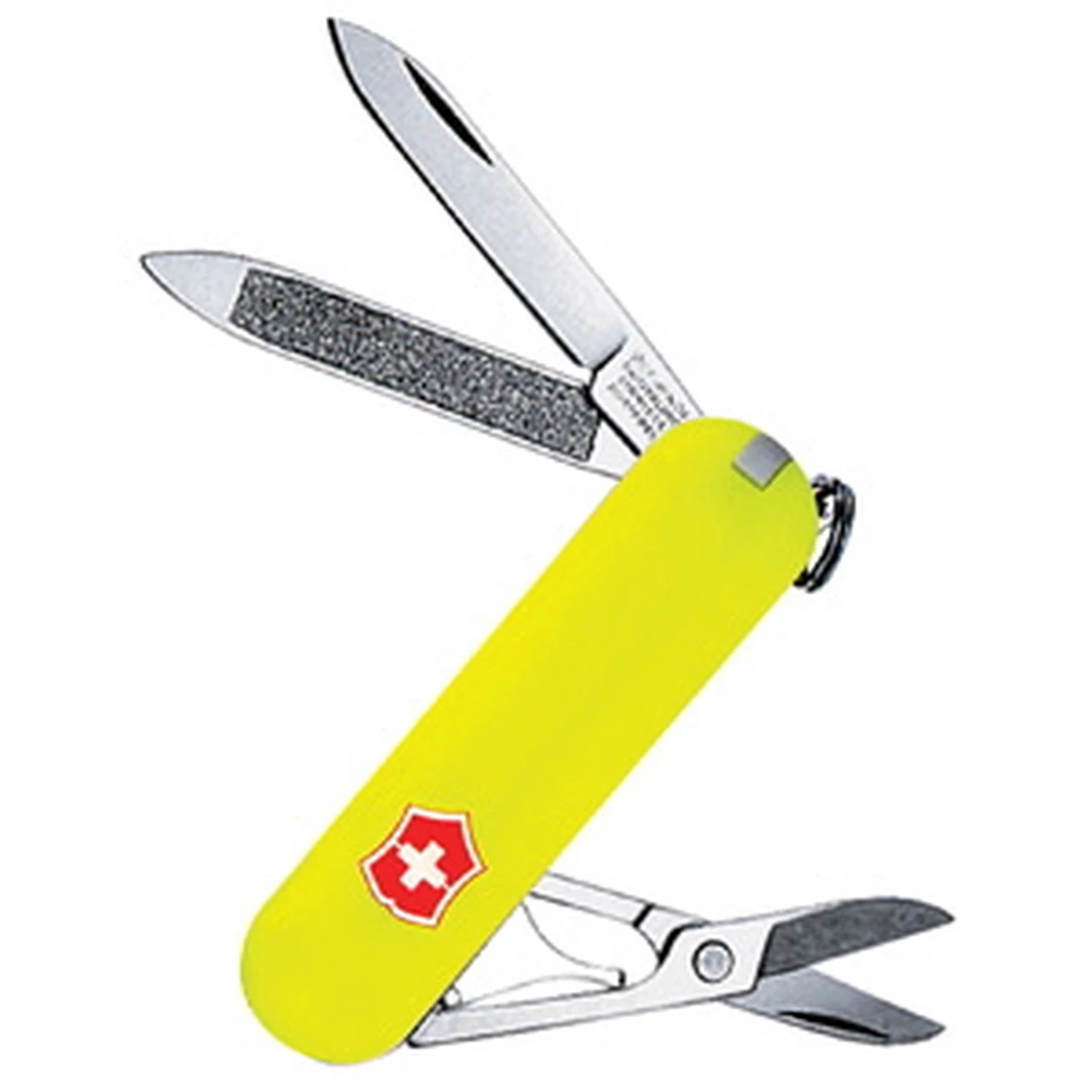 Victorinox StayGlow Classic SD. 2 1/4″ closed. Fluorescent yellow StayGlow handles, glow up to one hour. Features small blade, nail file with screwdriver tip, scissors, toothpick, tweezers and keyring