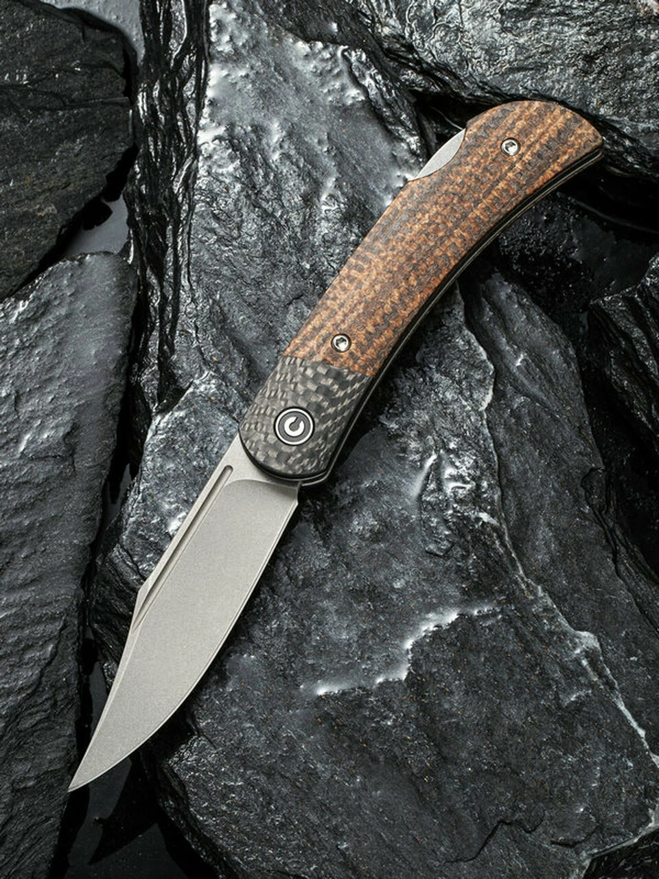 CIVIVI Rustic Gent C914E, 2.97″ D2 Gray Stonewashed Clip Point Blade, Dark Brown Matrix Micarta Handles w/Carbon Fiber Bolster