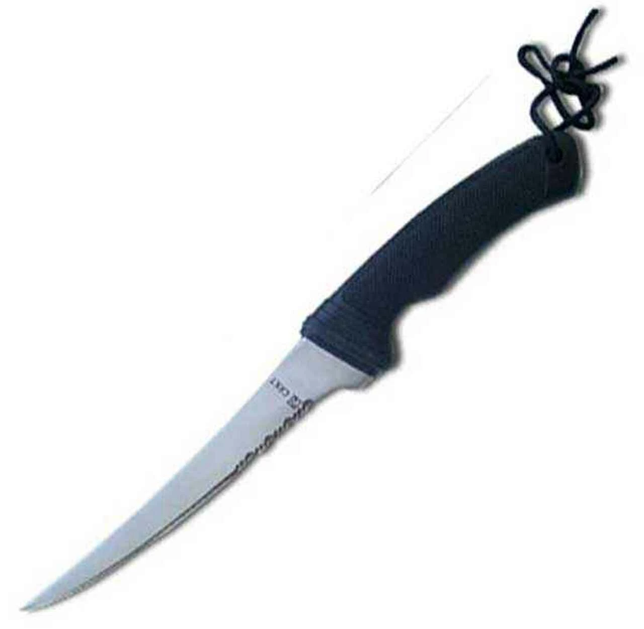 Innovation that takes your catch from the water to the frying pan in record time. This fishing knife will transform your tackle box forever. Designed by Alaska fishing guide, Russ Kommer, this blade breaks the mold for traditional fillet knife design. Most fillet knives rely on a symmetrical blade grind for cutting, but what Russ did was apply a hollow grind ton the topside and a flat grind on the bottom. This makes your fish fillets lift and float off the topside while the bottom side is gliding and not digging into the skin. The Triple-Point ™ serrations make quick work of bones, fins and gristle. The glass filled nylon handle is grippy and ergonomic. A glass filled nylon sheath keeps the blade safe in your tackle box.