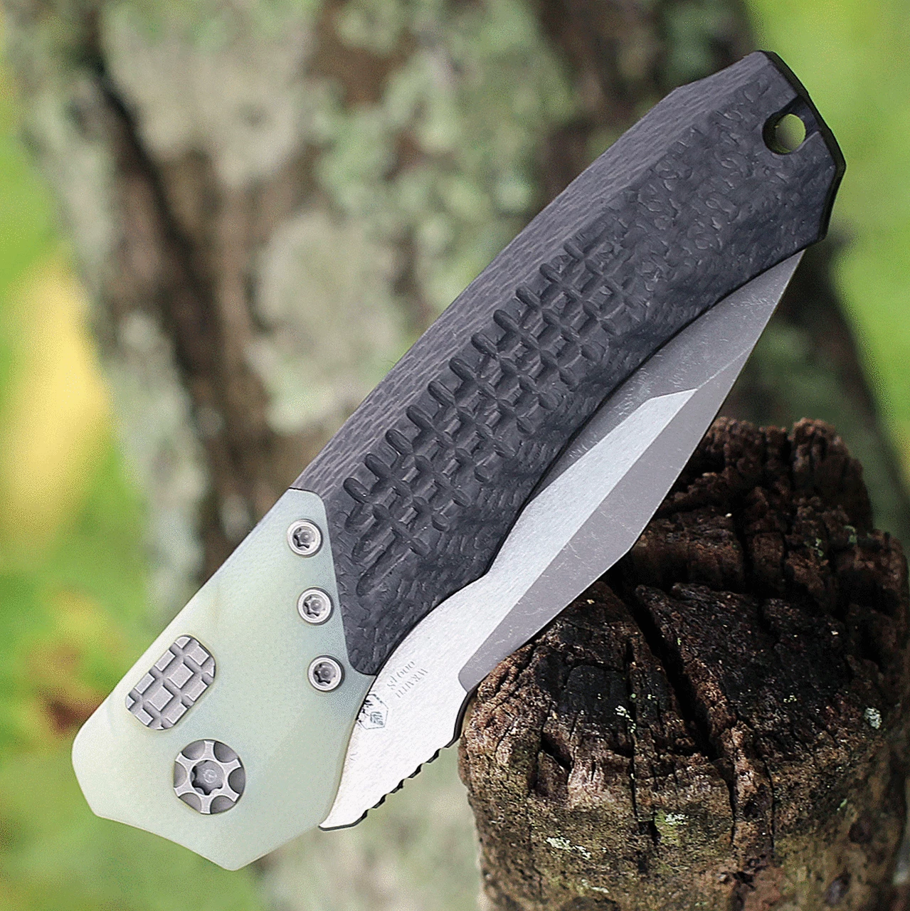 Heretic Knives Wraith V.2 Automatic H100-5A-JADE, 3.62″ Elmax Battleworn Tanto Blade, Carbon Fiber Handle w/ Jade Bolster