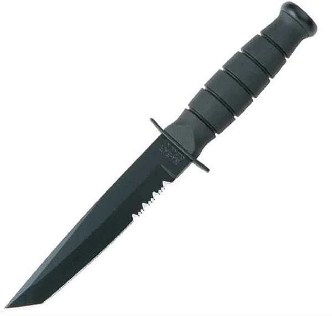 Ka-bar Short Ka-Bar. 9 3/8″ overall. 5 1/4″ partially serrated 1095 carbon steel tanto blade with black epoxy coating. Black grooved Kraton G handle with black coated steel guard and pommel. Black leather belt sheath.