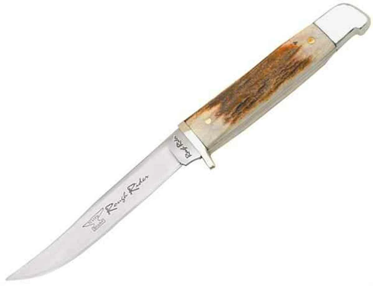 Rough Rider Small Hunter Stag. 6 1/4″ overall. 3 1/4″ stainless clip blade. Full tang. Genuine stag handles with nickel silver finger guard and pommel. Leather belt sheath.