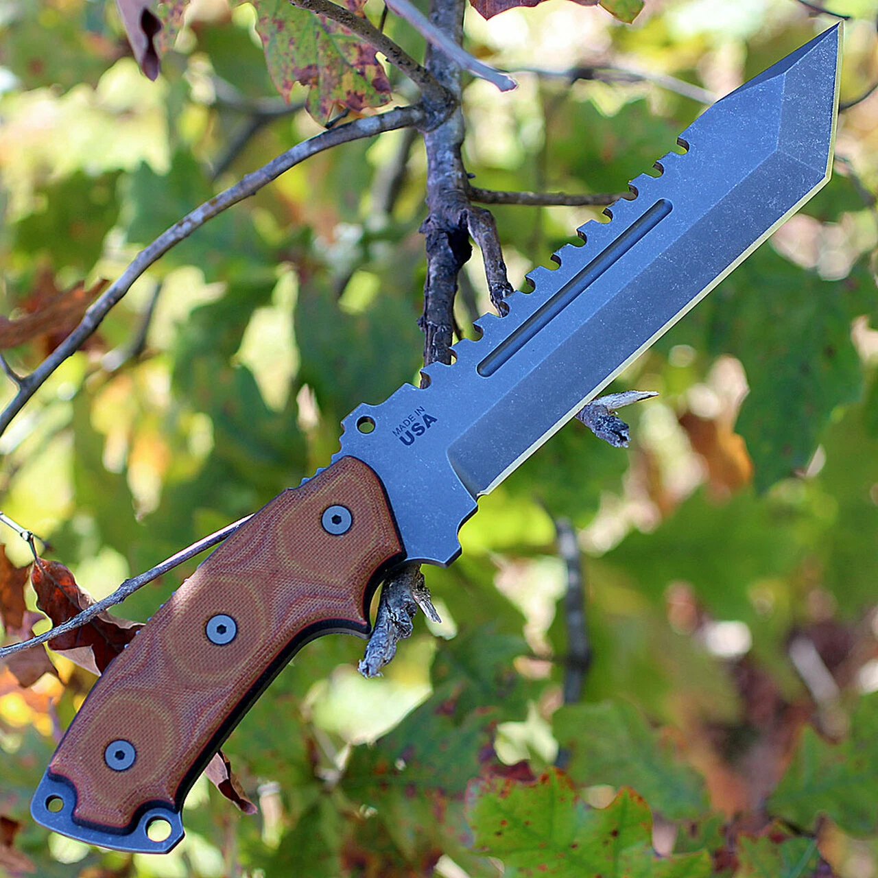 Its full-tang, 1/4″ 1095 high carbon steel is strong and easy to resharpen when needed. That’s a must in the field. The Acid Rain finish looks great and has a clear Cerakote to protect from rust. The sandwiched Micarta handles are meant to fill the hand like an ax handle. Micarta was chosen for its strength and grip, even when wet. Finally, it comes with a tan Kydex sheath to provide great retention, carry-ability, and ease of access to the knife.