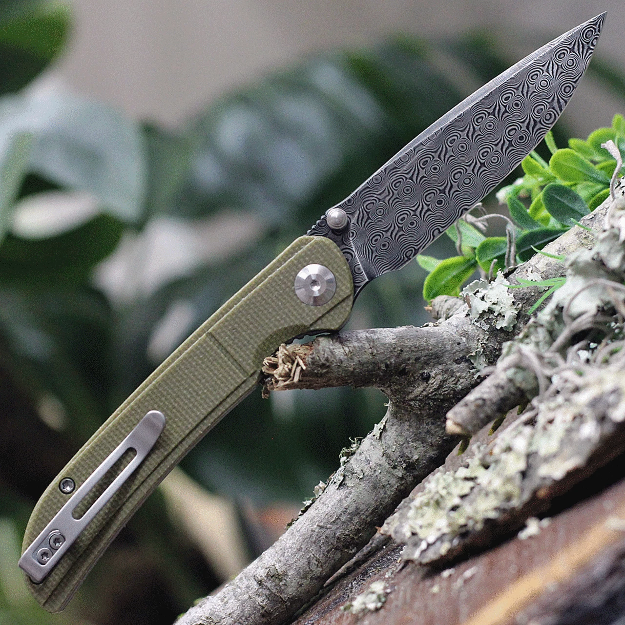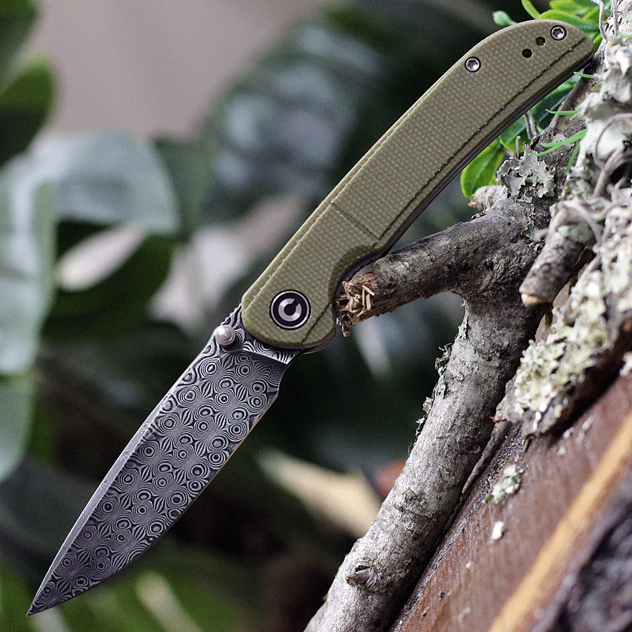 CIVIVI Imperium C2107DS-2, 3.47″ Damascus Drop Point Plain Blade, Olive Green Micarta Handle
