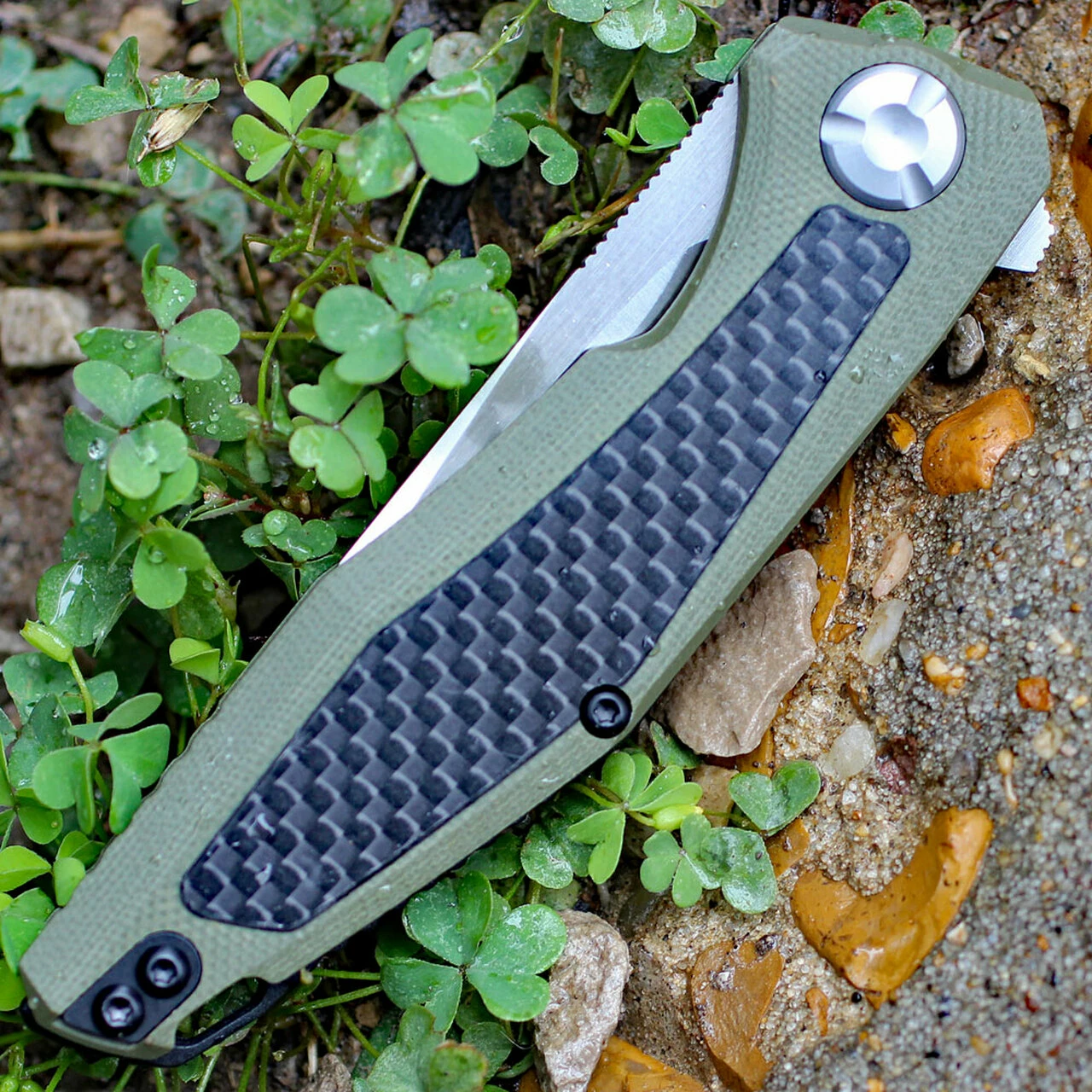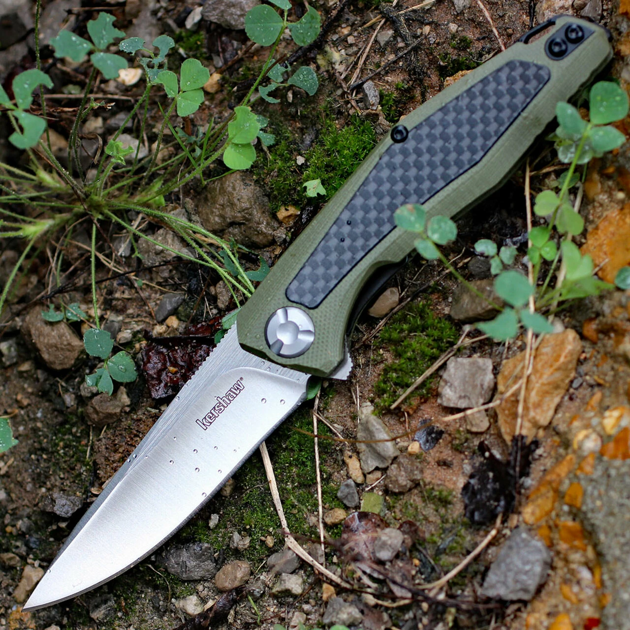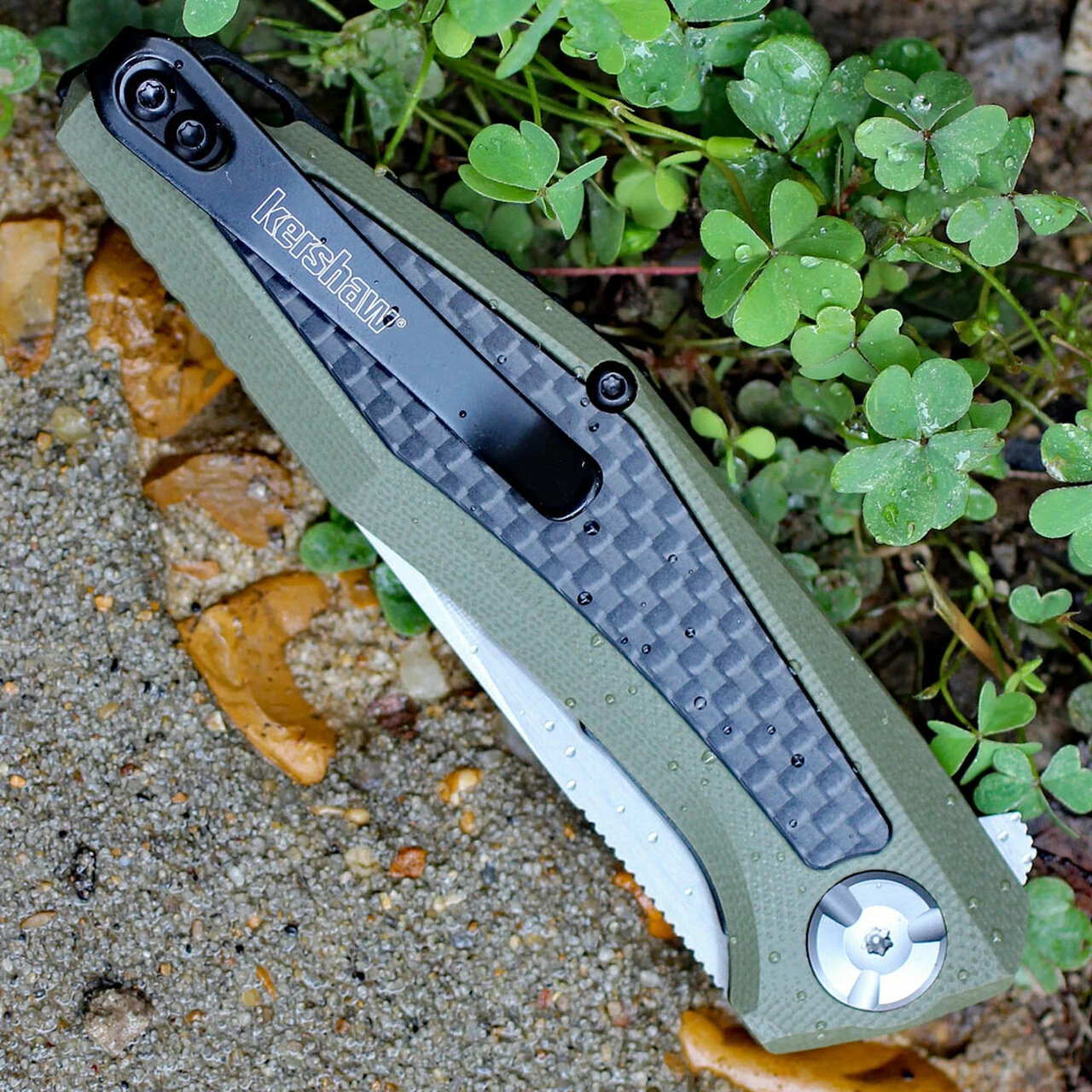 Designed by Dmitry Sinkevich, the Atmos features Sinkevich’s characteristic clean and practical design—but enhanced with extra detailing. In addition to the chamfered carbon-fiber, it also has a custom oversized pivot, a backspacer with wide lanyard attachment, and a reversible, deep-carry pocketclip. This manual knife opens quickly and easily with Kershaw’s KVT ball-bearing opening system. Extra detailing like this gives the Atmos a refined style that easily bridges the gap from workday to night on the town.