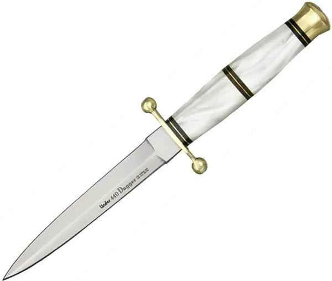 Linder Dagger. 9 1/8″ overall. 5″ 440 stainless dagger blade. White perlex handle with brass guard and pommel. Dark brown leather belt sheath.