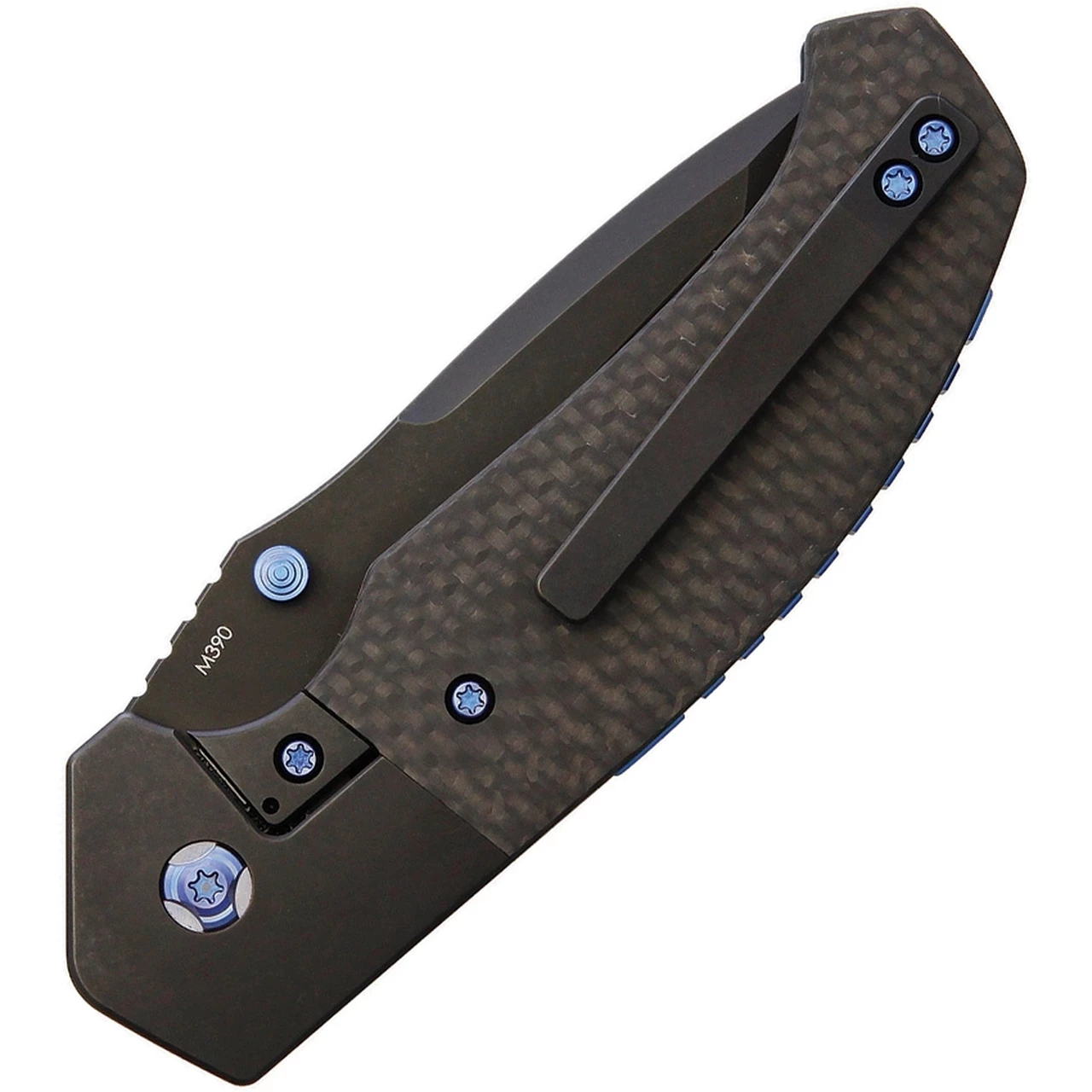 Enrique Pena is bringing his popular custom Diesel design to the production market with the Pena Knives Mini Diesel. This Mini Diesel model proudly showcases a black titanium frame with weave carbon fiber scales and a black PVD finished M390 blade. Pena teamed up with Reate Knives to bring you clean titanium construction at an affordable price point. This model is outfitted with a titanium pocket clip and flashy blue ano hardware and pivot.
