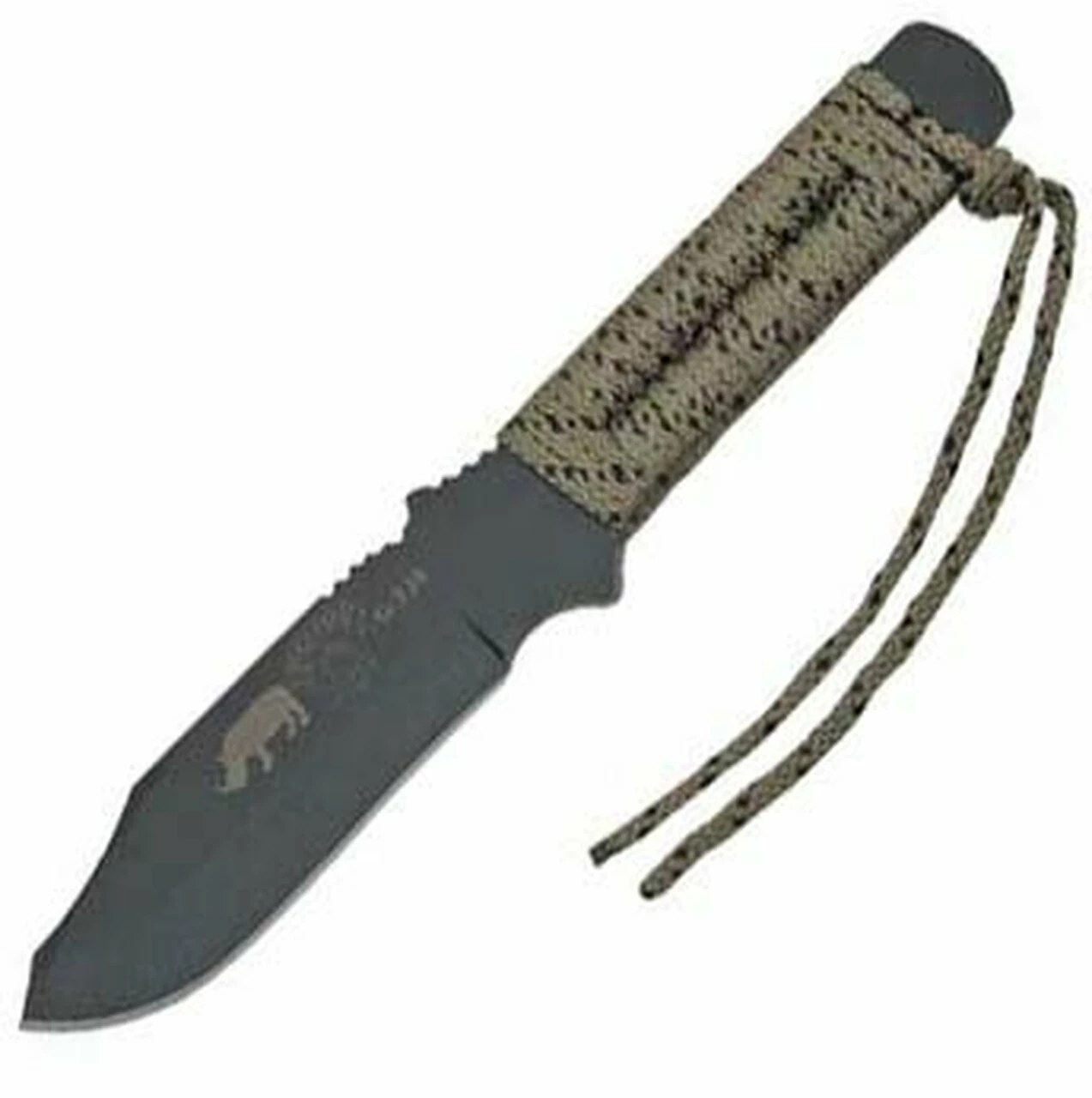 Tops Black Rhino. 10 5/8″ overall. 4 7/8″ black coated 1095 carbon steel blade. Full tang with pry bar end. Olive drab nylon paracord wrapped handle. Black Kydex belt clip sheath.