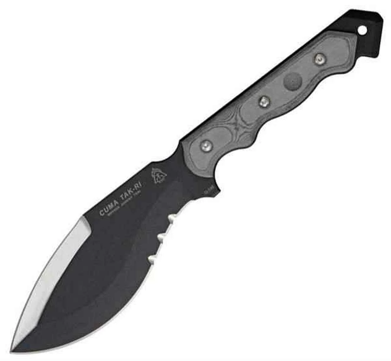 Tops CUMA TAK-RI 2 O/A Length: 13 1/2″ Top Edge: 4″ Bottom Edge: 7″ Thickness: 3/16″ Steel: 1095 High Carbon Steel RC 56-58 Handle Style: Woodsmen Style Micarta Blade Color: Black Traction Coating Sheath: Ballistic Nylon Desiged by: Waysun Johnny Tsai