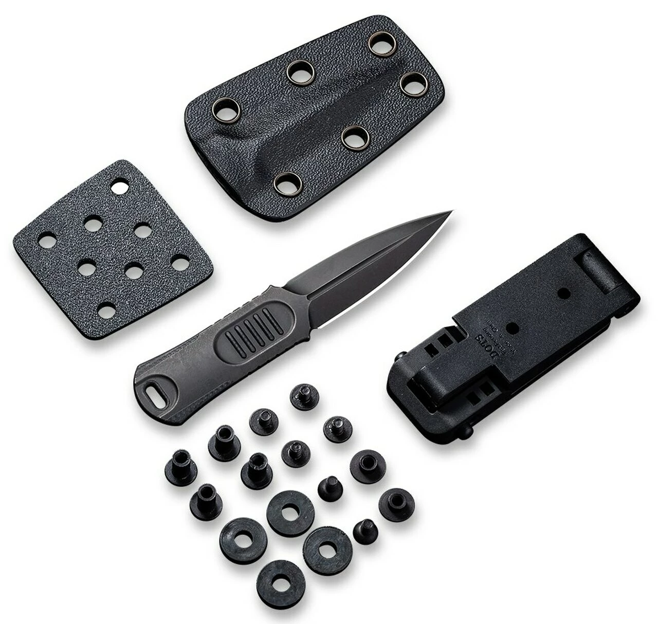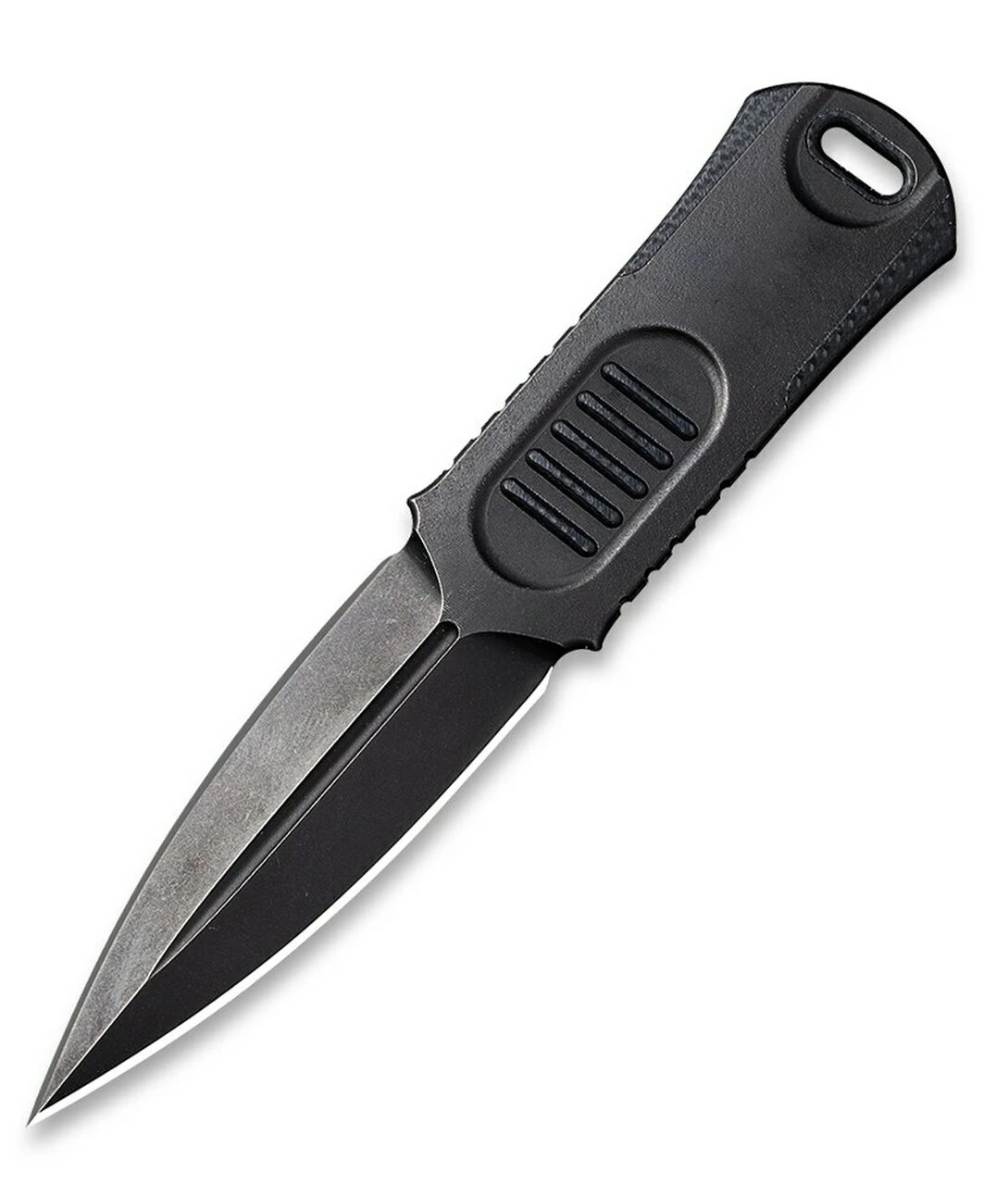 The WE Knife Co. Oss Dagger is a compact last-ditch self defense tool that doubles as a useful utility knife. It has a dagger shaped black stonewash finished blade. The steel is CPM-20CV. This model sports black G-10 inlays. This fixed blade comes with a fitted Kydex sheath.
