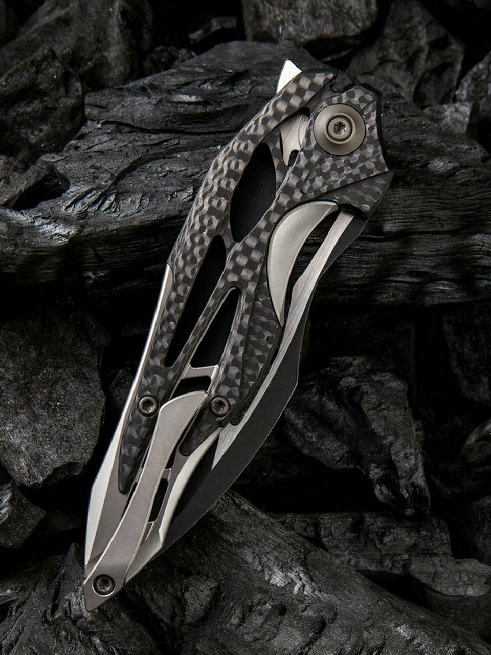 This model of the WE Knife Co. Arrakis sports a carbon fiber and gray titanium handle with a two-tone M390 blade.