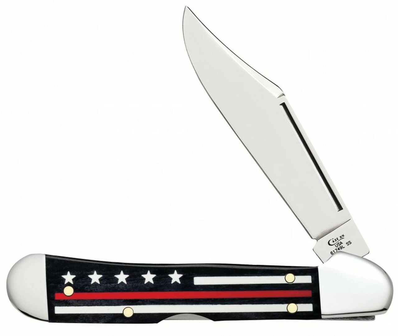 The Case Stripes of Service Series of knives is a tribute to first responders everywhere. The 07312 Case Stars of Service (61749LSS) Mini CopperLock Knife features a locking clip blade made of Tru-Sharp Surgical steel with a nail nick for opening. The Smooth Natural Bone handle of this Case knife, 3 5/8 inches closed, has Black, White and Red Line color wash embellishment, nickel silver bolsters and a lockback. The Case Mini CopperLock Knife weighs 2.0 ounces. Made in the USA.