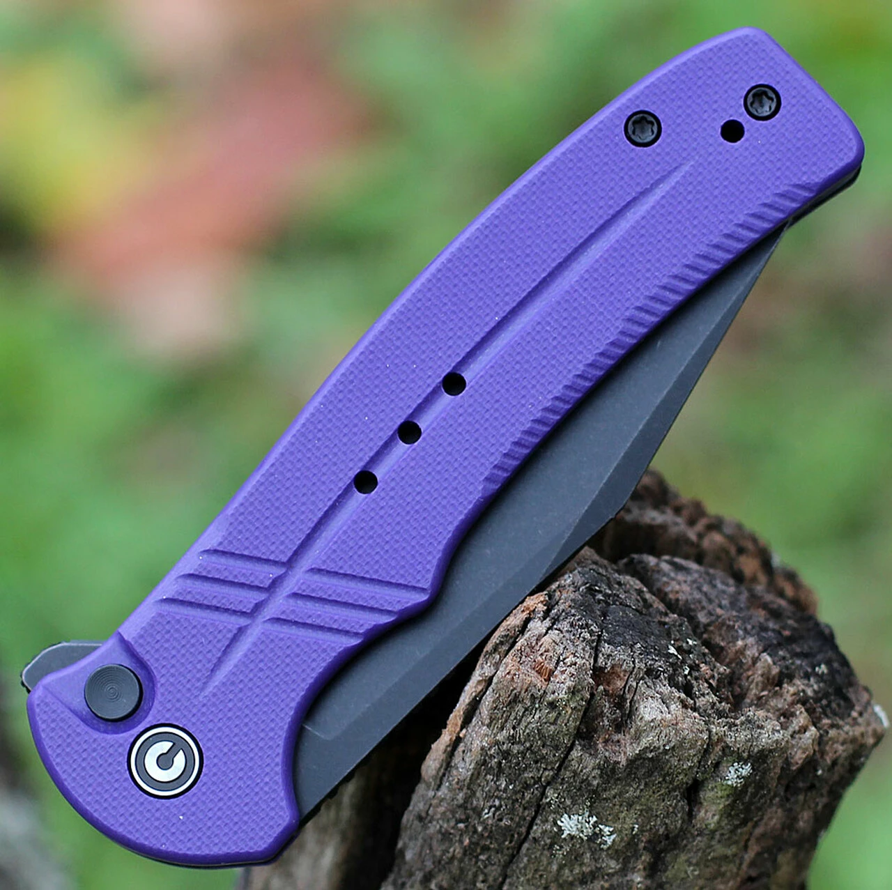CIVIVI Cogent Button Lock (C20038D-2) – 3.47″ 14C28N Black Stonewashed Plain Blade, Purple G10 Handle