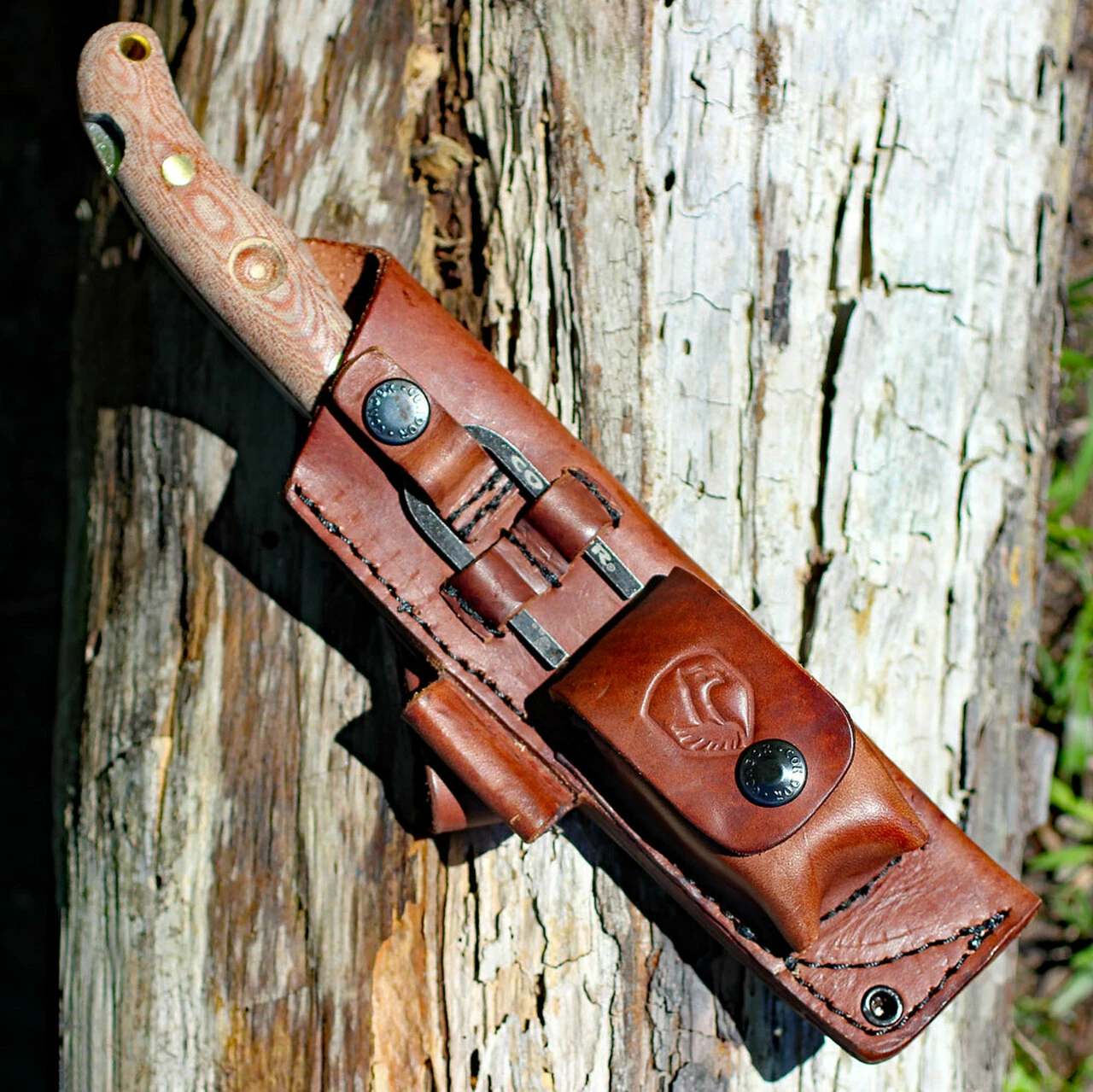 The Toki Knife has a full tang blade with a finger grip that facilitates carving or other tasks that require greater precision. It has a drop point and convex edge, which also allow greater efficiency, especially in hard work. Its curved handle in the back has a 90° striker for fire starting with ferrocerium rods. It also has a concave notch of excellent diameter, which allows the faster and more stable spinning for use as a “Bowdrill.”