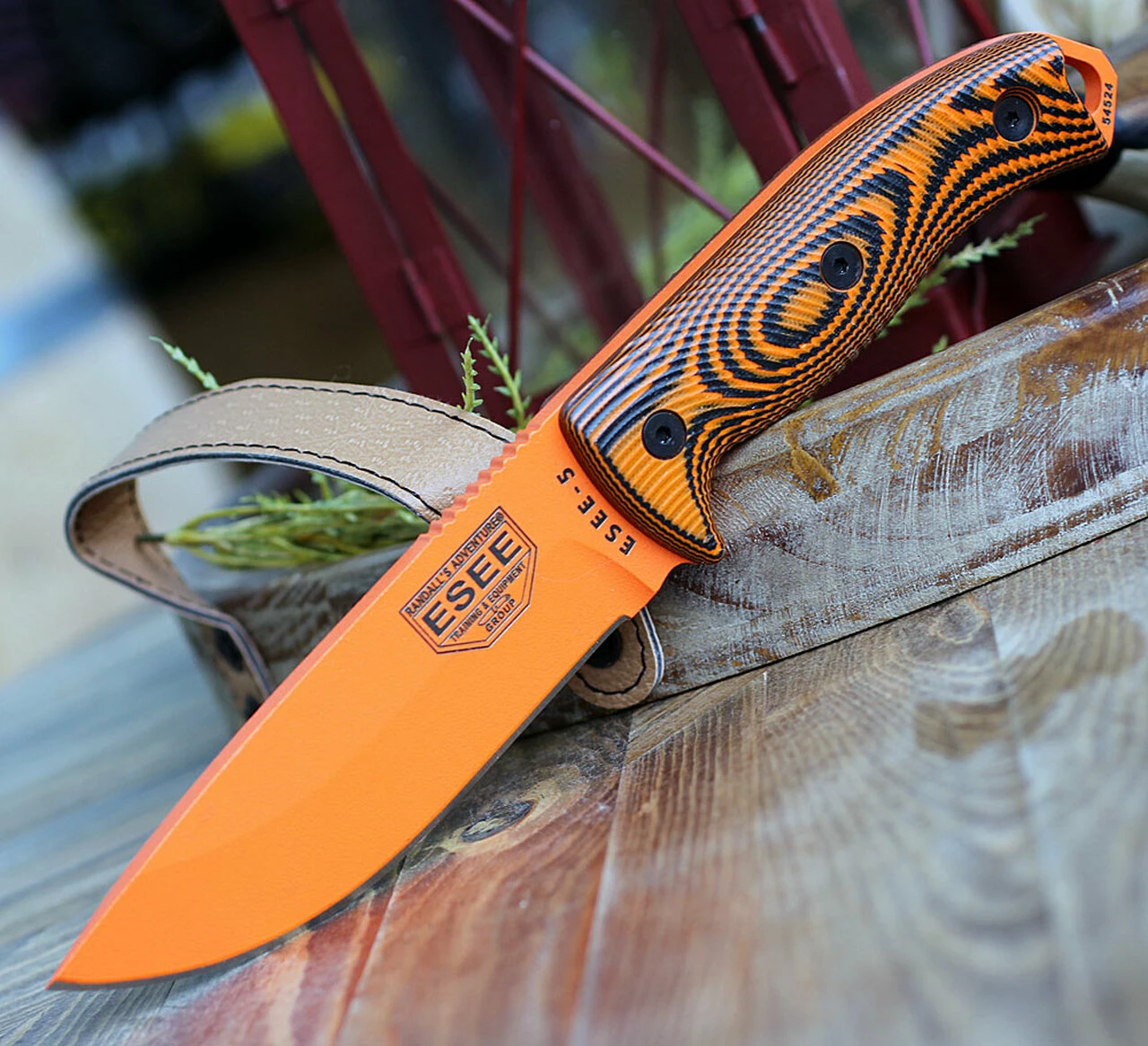 ESEE-5 5POR-006, 5.25″ 1095 Carbon Steel Orange Plain Blade, Orange/Black G10 3D Handle, Black Kydex Sheath
