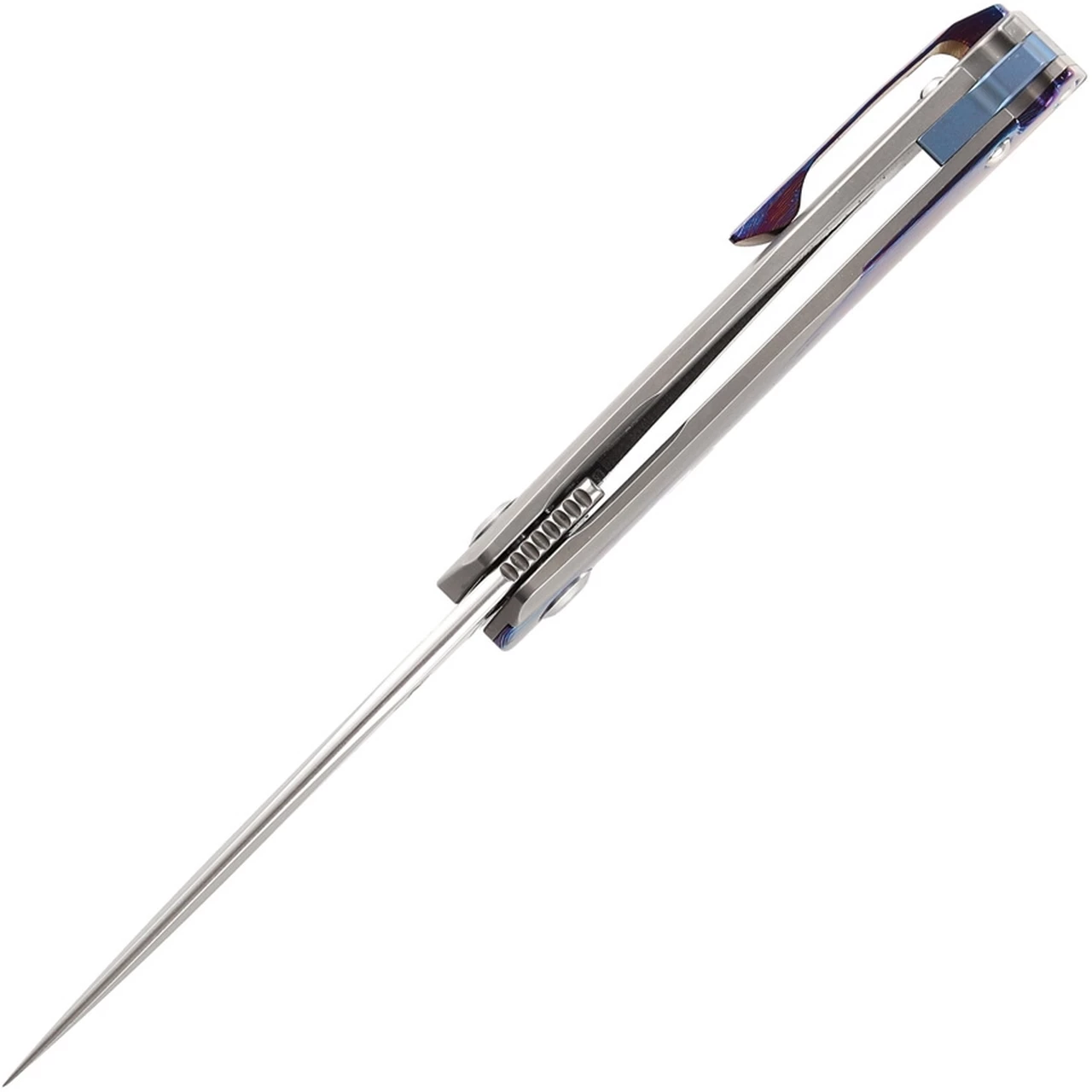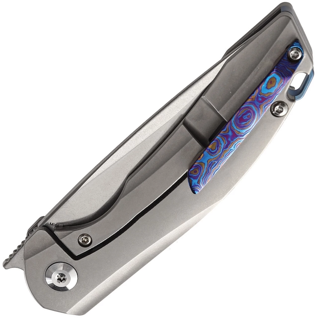 Ergonomic titanium handle with timascus inlay for a smooth gripping surface that is comfortable in the pocket or hand.