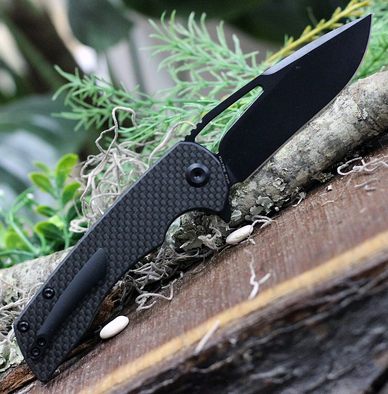 Kryo T1001 is a budget-friendly product line newly released by Kansept. The Kansept T1001A3 is built with a black coating D2 drop point blade and black carbon fiber handle.The D2 blade provides a reliable edge that delivers solid cutting performance in outdoor and urban environments alike. The Ball Bearing system provides smooth opening and the liner lock firmly secures the blade in the open position.