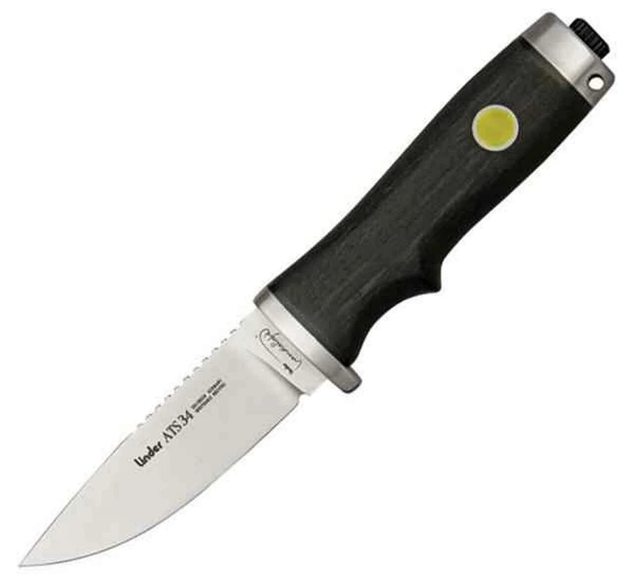 Linder Handlelight. 9 1/4″ overall. 3 1/2″ ATS-34 stainless drop point blade. Ebony wood comfort grip handle with stainless finger guard and pommel with lanyard hole. Handle features a unique glow stick light system. Two light conductive cones of acrylic glass which are encased in aluminum rings, are inserted into the wood handles. When using the knife in the dark, activate a glow stick by slight bending and shaking until it glows. Unscrew pommel end of knife and insert glow stick. Yellow light will glow for several hours. 20 glow sticks are included. Black leather belt sheath. Packaged in deluxe cardboard gift/storge box. Designed by Peter Rosenkaimer.