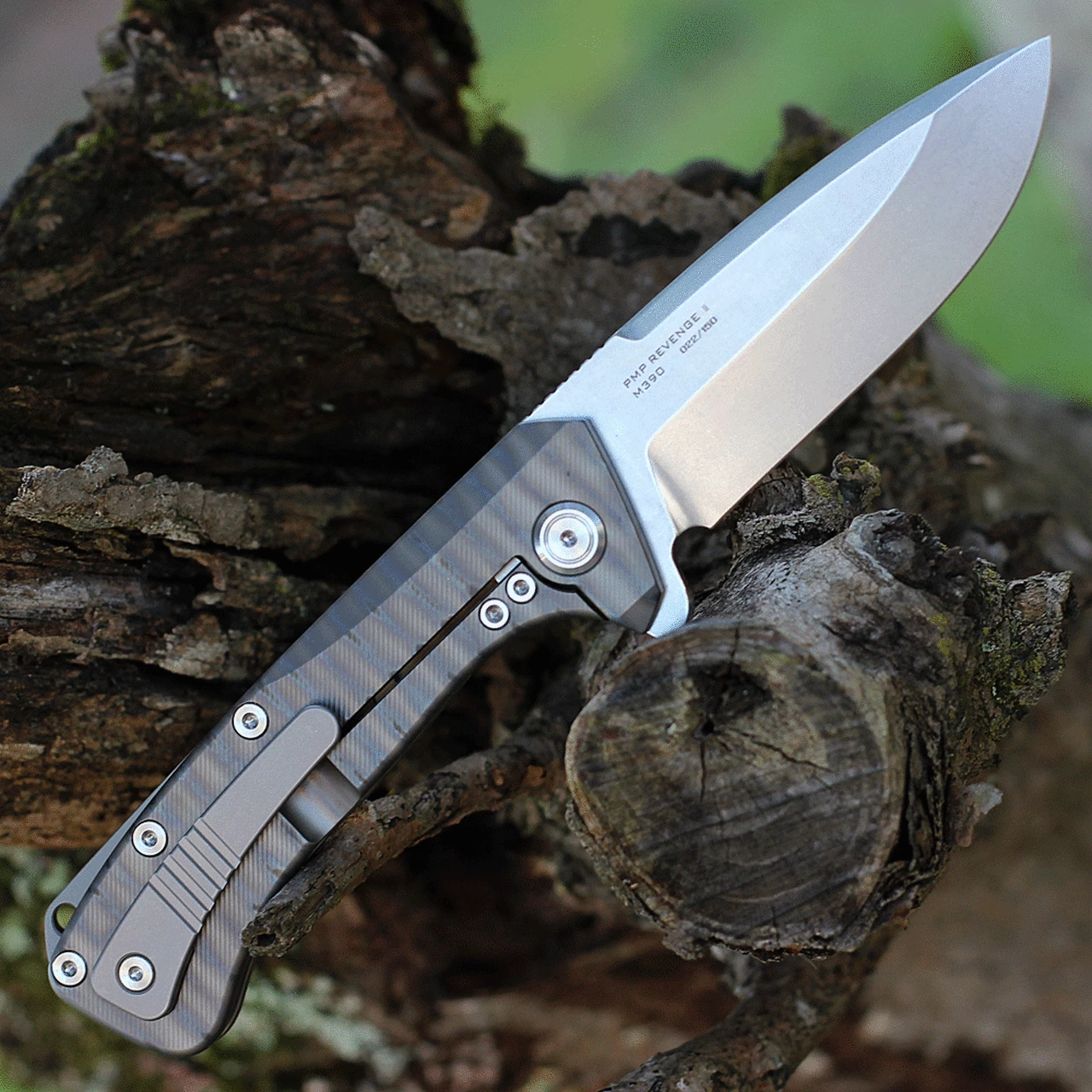 PMP Knives Revenge II Frame Lock Knife – 3.74″ M390 Satin Drop Point Plain Blade, Flame Textured Titanium Handle