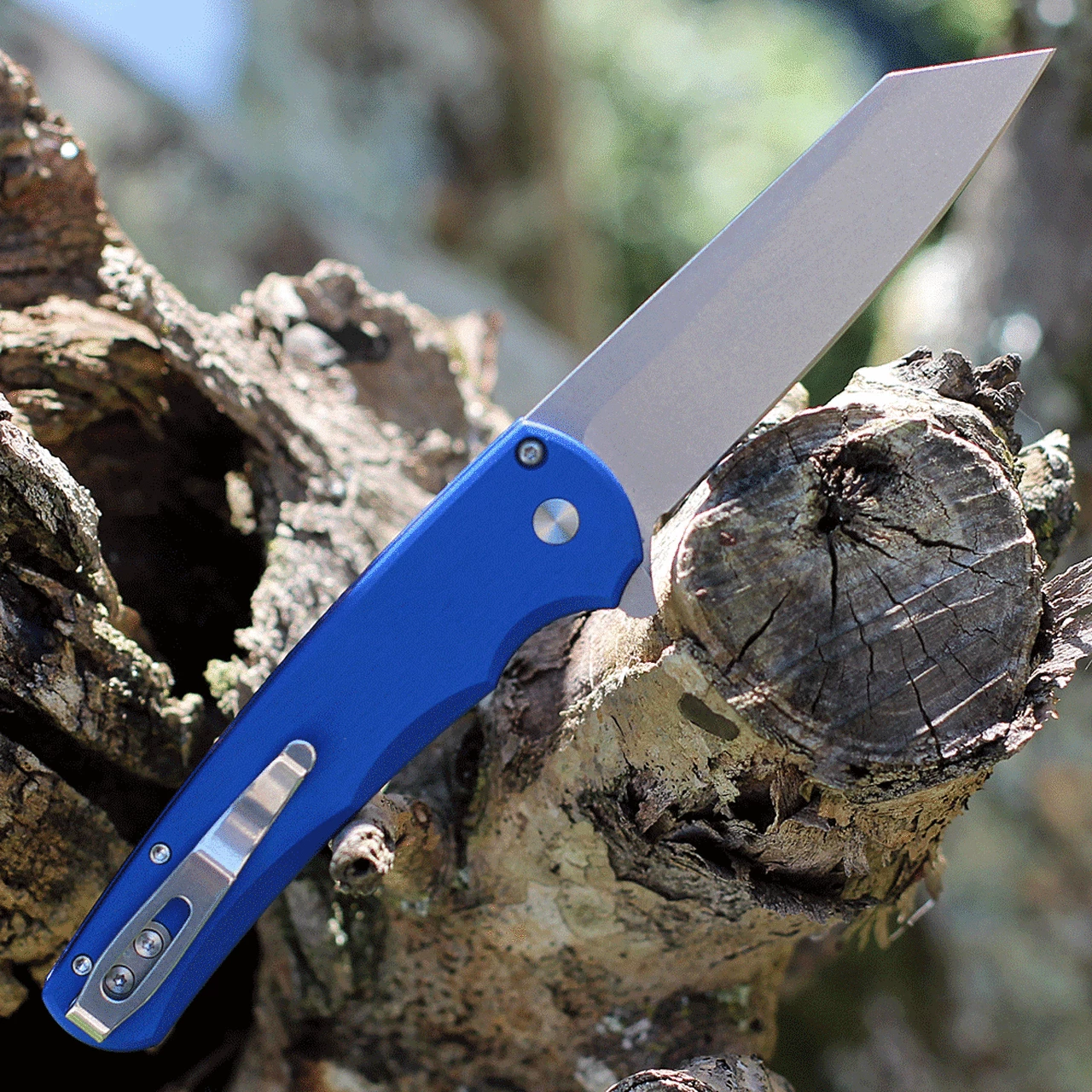 The Malibu 5201-BLULE Reverse Tanto by Pro-Tech features blue anodized 7075 aluminum handles, stonewashed reverse Tanto blade in CPM0-20CV blade steel, stonewased hardware, and a stonewashed deep carry clip.