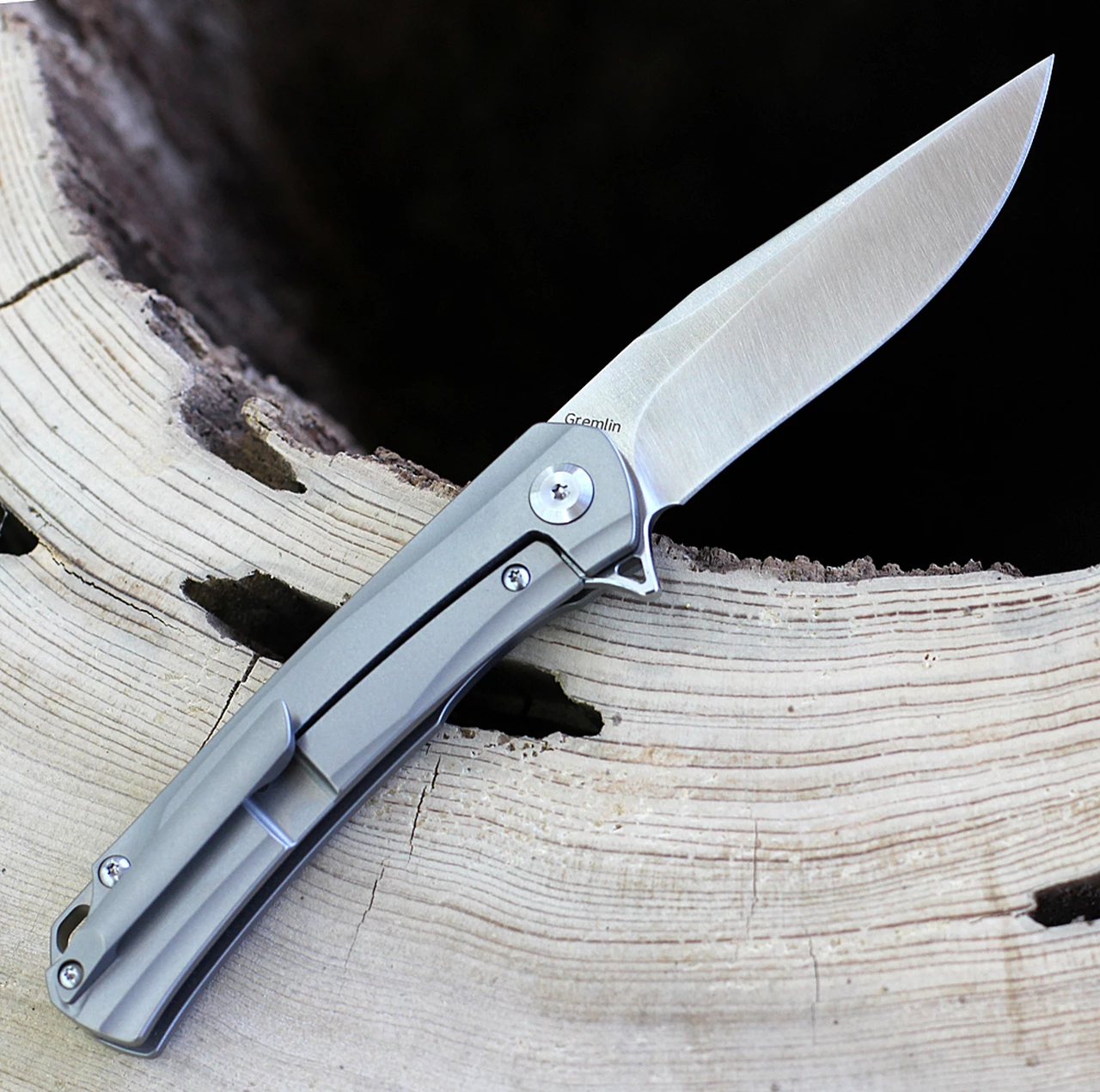 The K2003A2 Gremlin is a smooth flipper knife with an ergonomic build for everyday carry. This model is a scale down version of Sprite. It sports a bead blasted titanium handle carbon fiber inlays and a clip point blade made from CPM-S35VN stainless steel in a satin finish. A secure titanium pocket clip and ultra thin profile allows comfortable daily carry.The Gremlin provides a comfortable, ergonomic design that is the perfect size for EDC use.