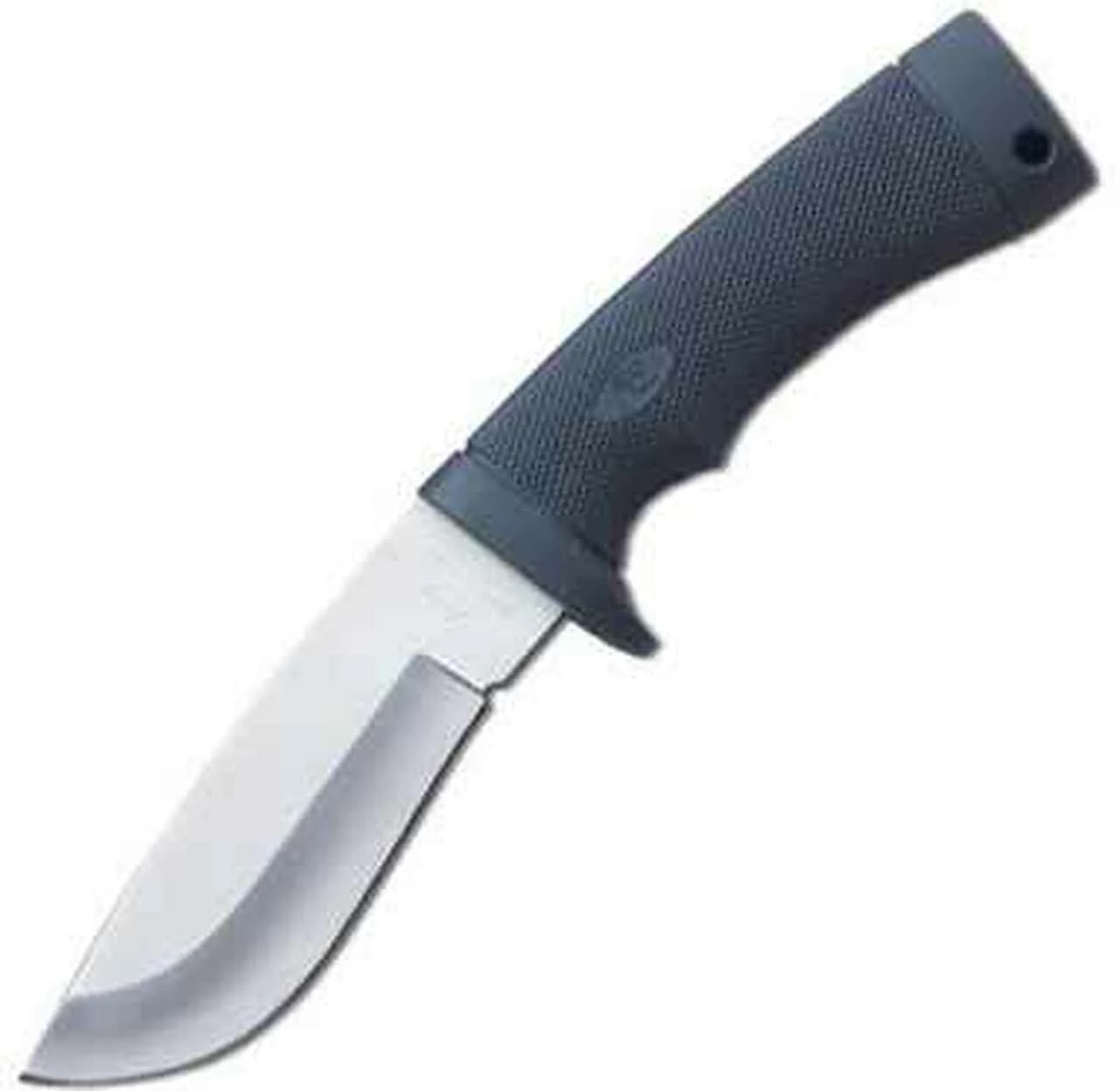 Katz Black Kat Series Fixed Blade. 9 1/4″ overall. 4 1/2″ XT-70 stainless satin finish blade. Full tang. Black Kraton diamond checkered handle with flared butt. Lanyard hole. Black cordura belt sheath.