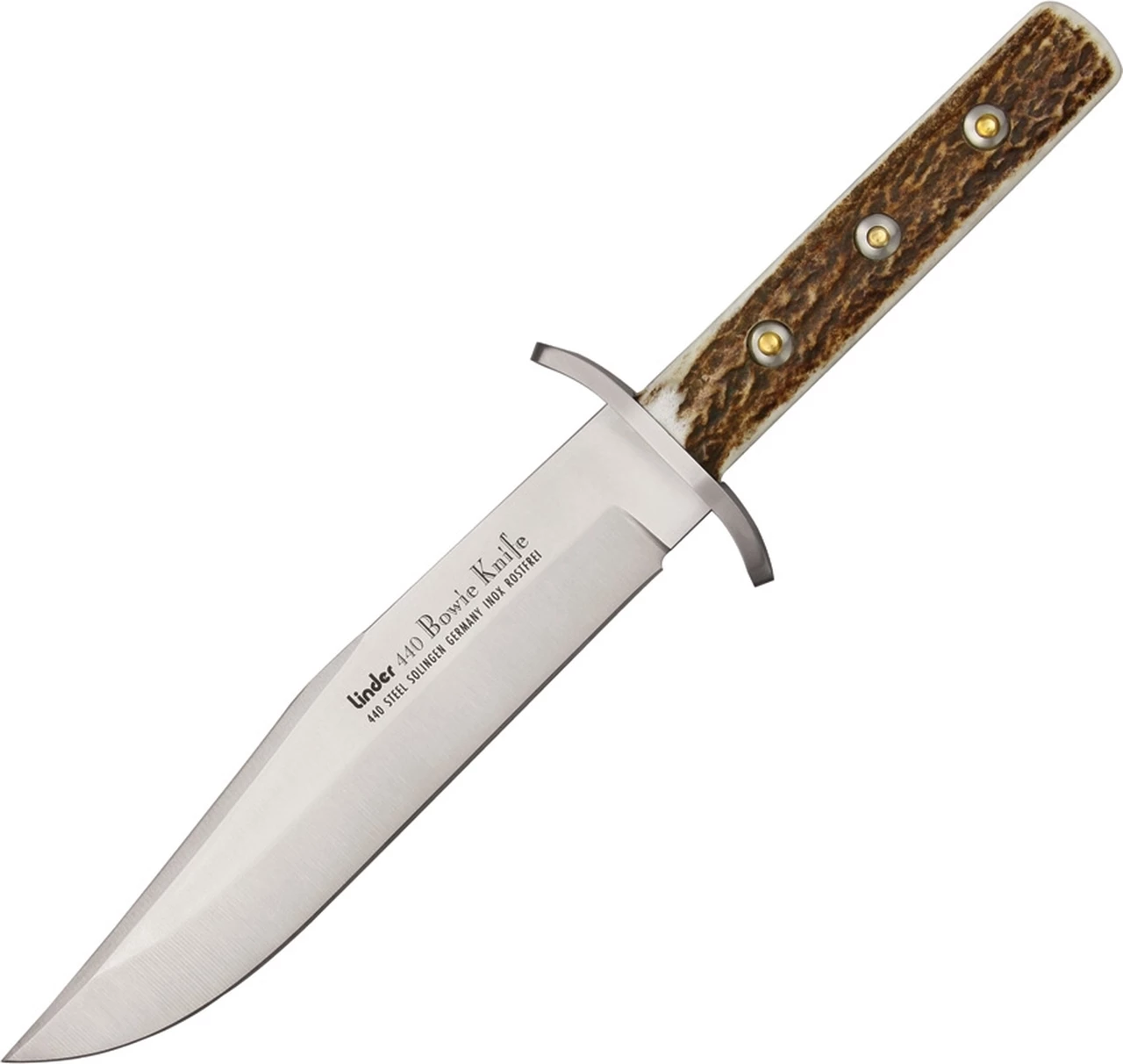 Linder Bowie. 12 3/4″ overall. 7 3/4″ 440 stainless bowie blade. Full tang. Genuine stag handles. Stainless guard. Brown leather belt sheath with leather lanyard.