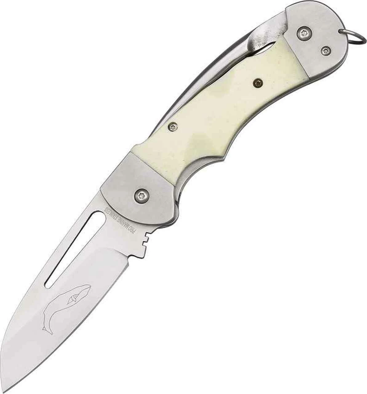 Myerchin Generation 2 Captain – Classic Series. 4 5/8″ closed linerlock. 3 1/4″ German Pro Marine stainless sheepsfoot blade with shackle slot. White natural smooth bone handles with stainless bolsters and 2 3/8″ locking stainless marlin spike. Lanyard hole with keyring. Stainless pocket clip with slot cutout design. Black nylon belt sheath. Serial numbered.