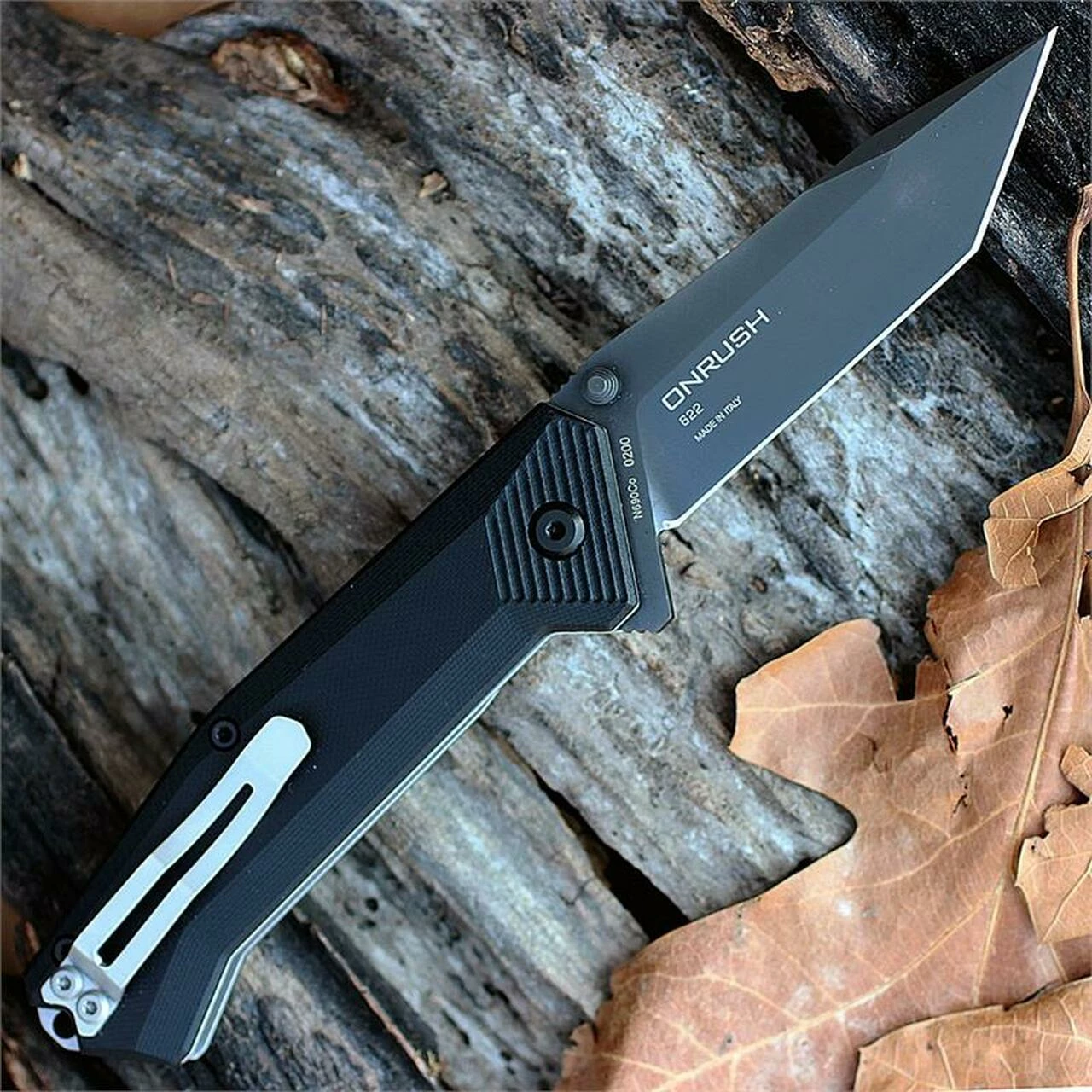 If the Bruiser is too large for your taste, the Onrush is the knife for you. Sharing most of the characteristics of its older brother the Bruiser, the Onrush knife is more compact and better suited for everyday use and carry. The N690Co blade has been treated with a PVD coating for excellent wear and corrosion resistance. The Onrush 622 version features a predatory tanto blade. The smooth yet slip-resistant G10 handle is comfortable and provides a secure grip. Notches on the spacer further enhance grip and control. The Onrush may be opened by its thumbstud or by its flipper, which enlarges the finger guard in the open position. Similar to the Bruiser, the Onrush features a glass-breaker, which is made from a separate piece of hardened steel and is removable. Its clip may be installed in two places, making the Onrush suitable for left-handed users. The Onrush comes with an Italian-made 1000d Cordura case.