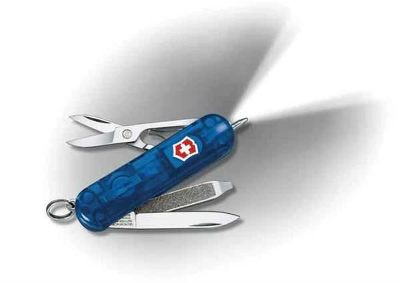 Victorinox Signature Lite. 2 1/4″ closed. Translucent sapphire handles. Features blade, nail file with screwdriver tip, scissors, retractable ball point pen, white LED light and keyring.