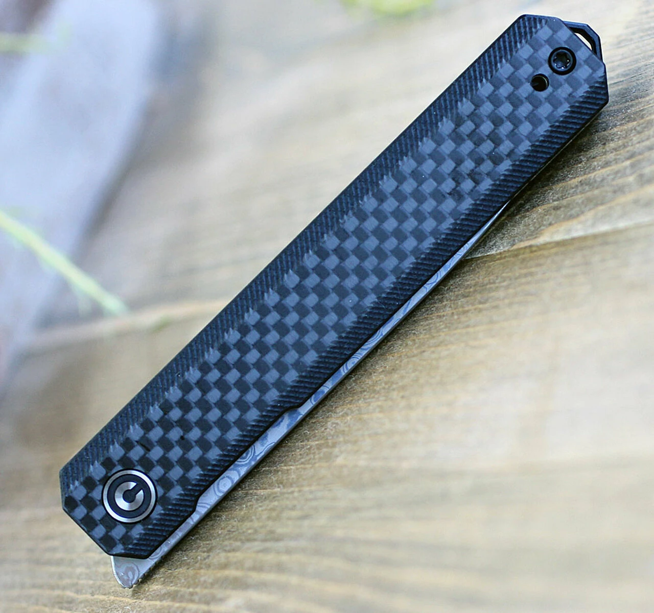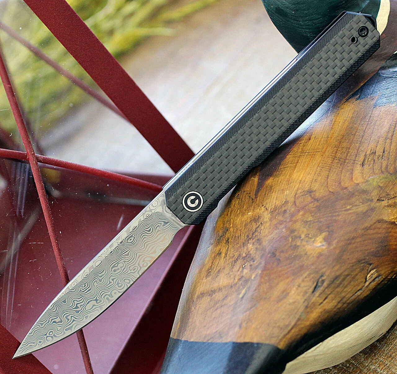 CIVIVI Exarch C2003DS-1, 3.22″ Damascus Drop Point Blade, Black G-10 Handles w/Twill Carbon Fiber Overlay