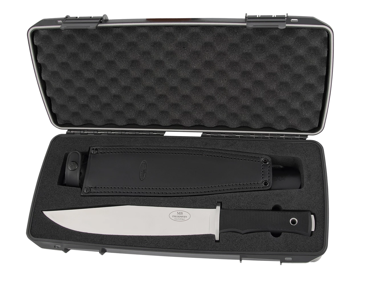 Fallkniven Modern Bowie MB10, 10″ Laminate Cos Satin Convex Blade, Black Thermorun Handle, Black Leather Sheath – Premium Package