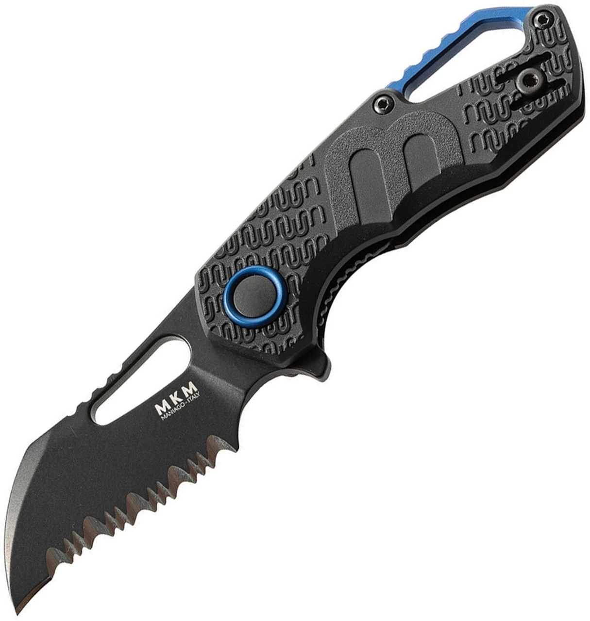 MKM – Maniago Knife Makers Isonzo Black Coated Serrated Hawkbill Blade, Black FRN Handle, Blue Aluminium Spacer