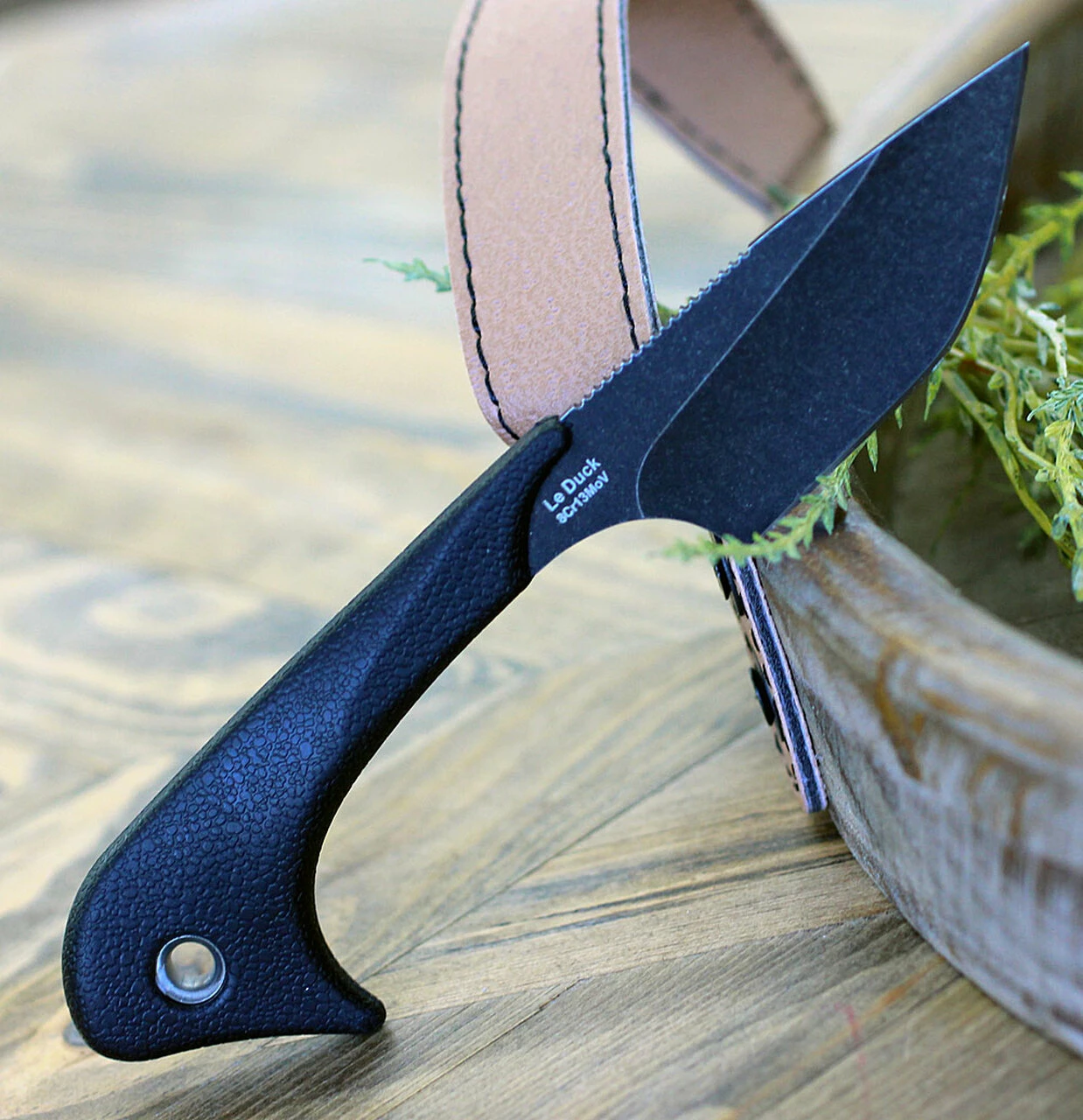 This multi-purpose utility knife is perfect for all outdoor uses and as a lightweight backup blade for any survival situation. The 2.5” Blackstone™ coated 8Cr14MoV stainless blade is precisely heat treated and hand finished shaving-sharp for superior edge retention and performance. The distinct duck head handle with TPR coating is extremely comfortable for a secure lock-on grip, even when wet. Features a multi-carry sheath system with a 360 degree rotating clip that attaches to any flotation, fishing, or diving vest, and is compatible with any MOLLE system. The clip is removable and replaceable via two Chicago-style fasteners, and the included 550 Paracord lanyard quickly converts the Le Duck to a neck knife. Designed by custom knife maker Jerry Hossom.