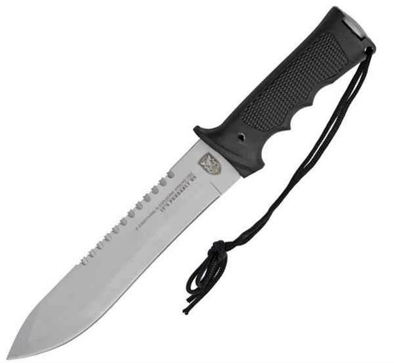 United S.O.A. Survival ORMD Knife. 13 3/4″ overall. 8 1/2″ AUS-6 stainless blade with sawback and matte finish. Black finger grooved composition handle with checkered grip. Lanyard hole. Black nylon lanyard. Screw-on cap with integrated compass. Survival kit includes a bandaid, waterproof matches with strike board, fish hook and fishing line. All store inside a clear plexiglass container inside handle of knife. Black nylon belt sheath with nylon cord wrap, ABS liner and leg ties. A rifle cartridge holder stores high-powered rifle ammo in an emergency storage compartment built into the sheath liner so you’ll be prepared for anything.