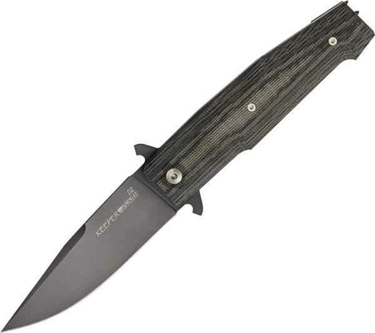 Viper Keeper Linerlock. 4 1/2″ closed. 3 3/4″ black PVD coated D2 steel blade with false bayonet grind and double guard. Stainless liners. Black micarta handles. Stainless wire design pocket clip.