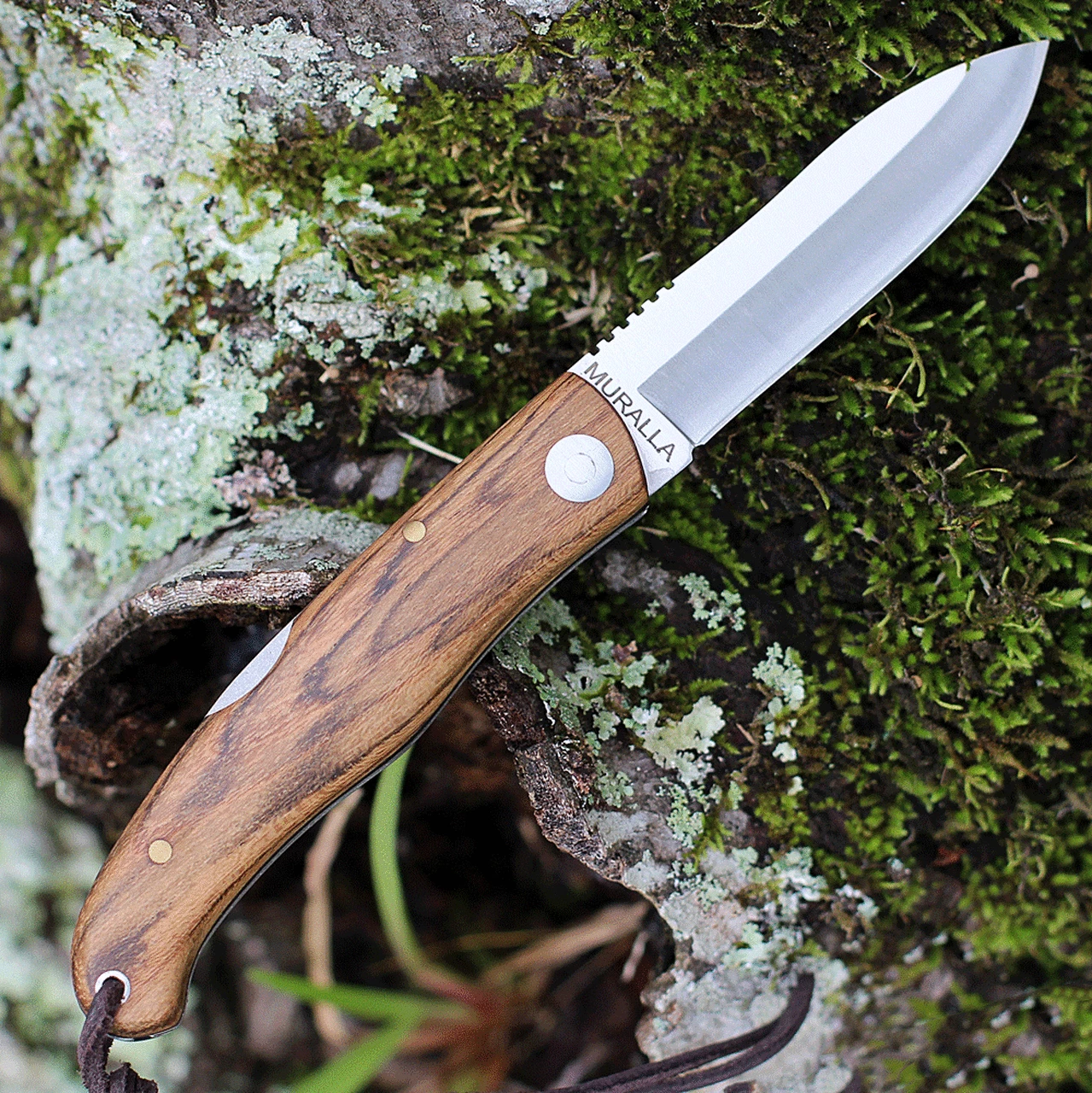 Muralla means “rampart” which are the defensive walls that surround a castle. This crucial fortification element is what inspired the jimping on the spine of this modified spear point blade. The Muralla is a stout everyday knife which feels great in-hand and is easily controllable. The Muralla features a 2.875″ Sandvik 14C28N stainless steel modified spear point blade and bocote wood handles. It is designed to be opened with two hands and has a solid lockback mechanism. The Muralla comes complete with a leather lanyard and brown leather sheath.