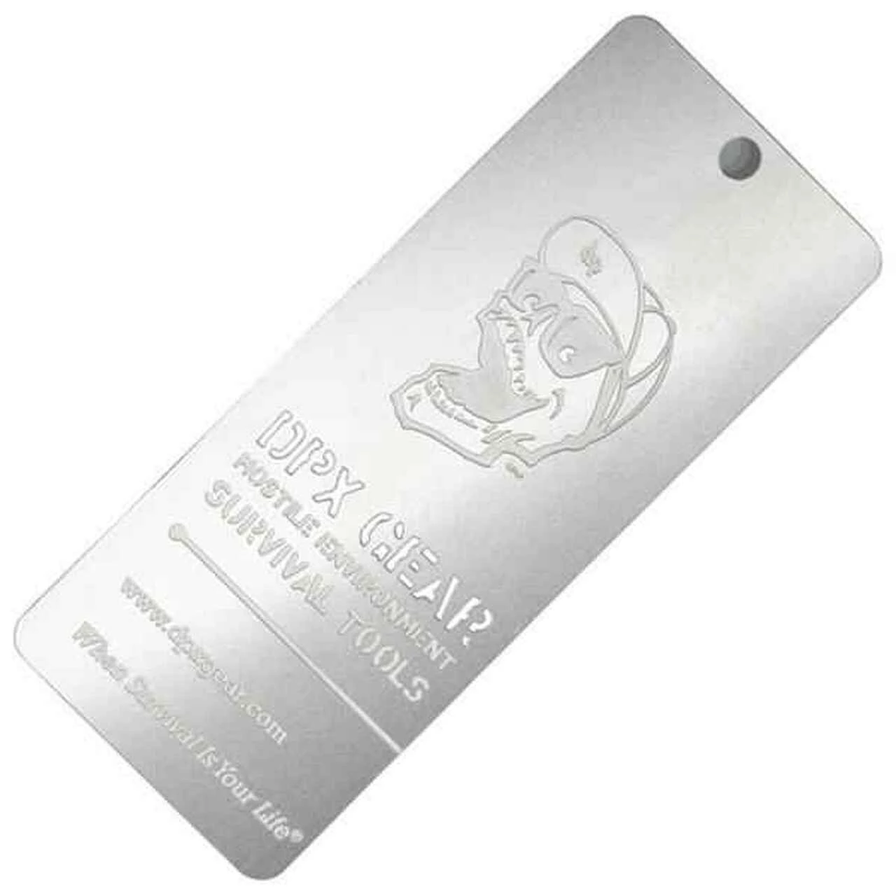DPX Danger Tag. Measures 3″ x 1 1/4″. Thin, stainless-steel tag is crimped on the back so that the sides may be broken off to form an instant self-defense tool or with a few snaps becomes a serrated and straight edge. Designed for field sharpening or box opening. May also be worn on a paracord or neck chain like dog tags.