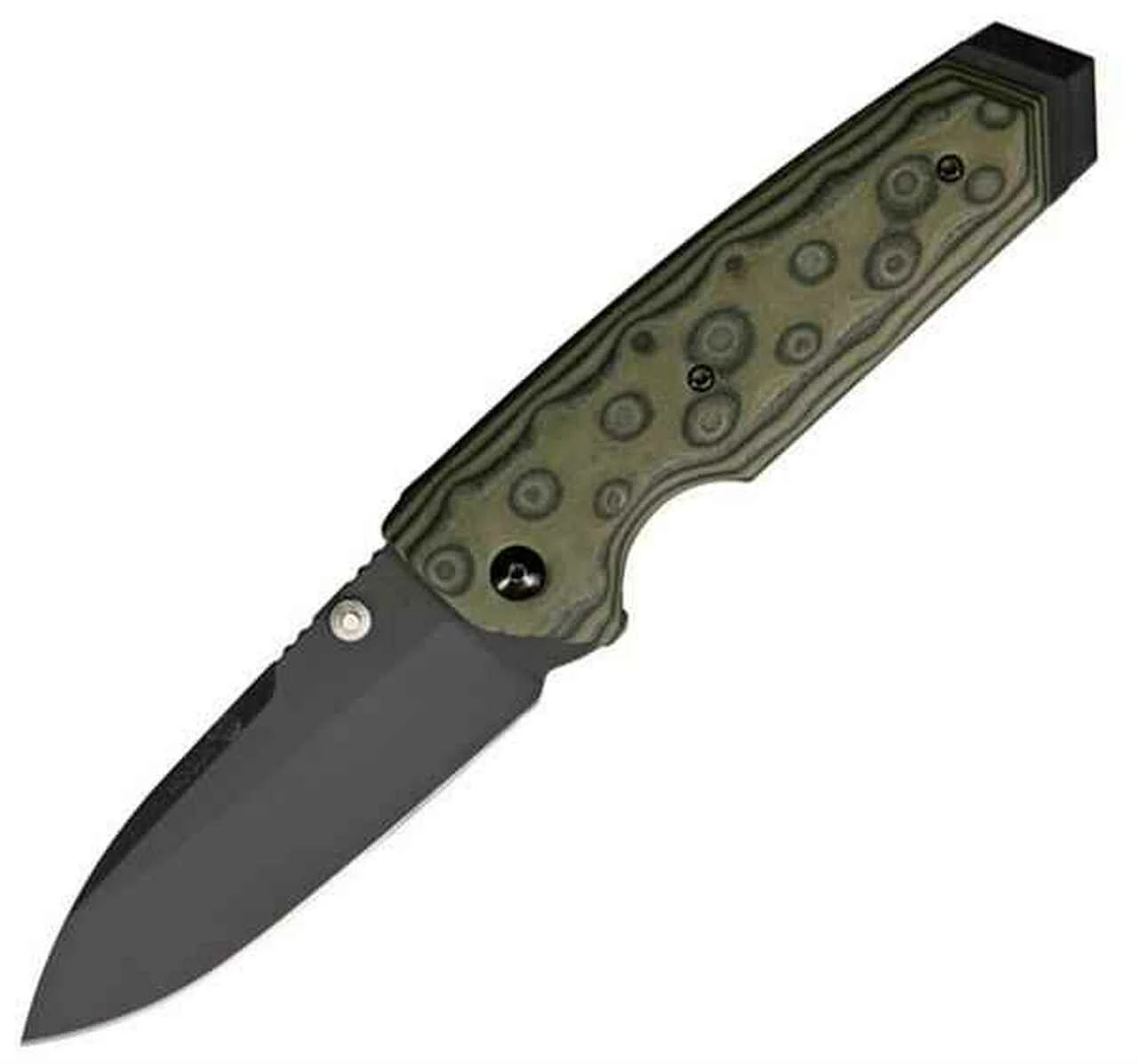 Hogue EX-02 Extreme Series Linerlock. 5″ closed. 3 5/8″ black finish 154CM stainless spear point blade with dual thumb studs. Manual safety lock doubly secures knife in open position. Green G-Mascus G-10 handle scales. Integrated glass breaker pommel. Reversible stainless pocket clip. Elishewitz design.