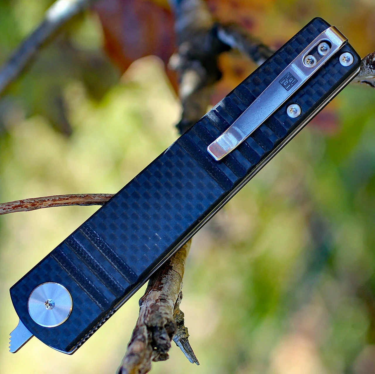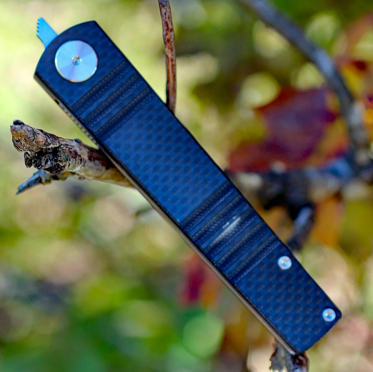 The handles are fitted with three precision machined finishes of which two are G10 and one Carbon Fiber. Impeccable straight lines have been machined out of the material adding to the traditional Asian feel. This knife like many others offers a great amount of leeway of choice in finish.