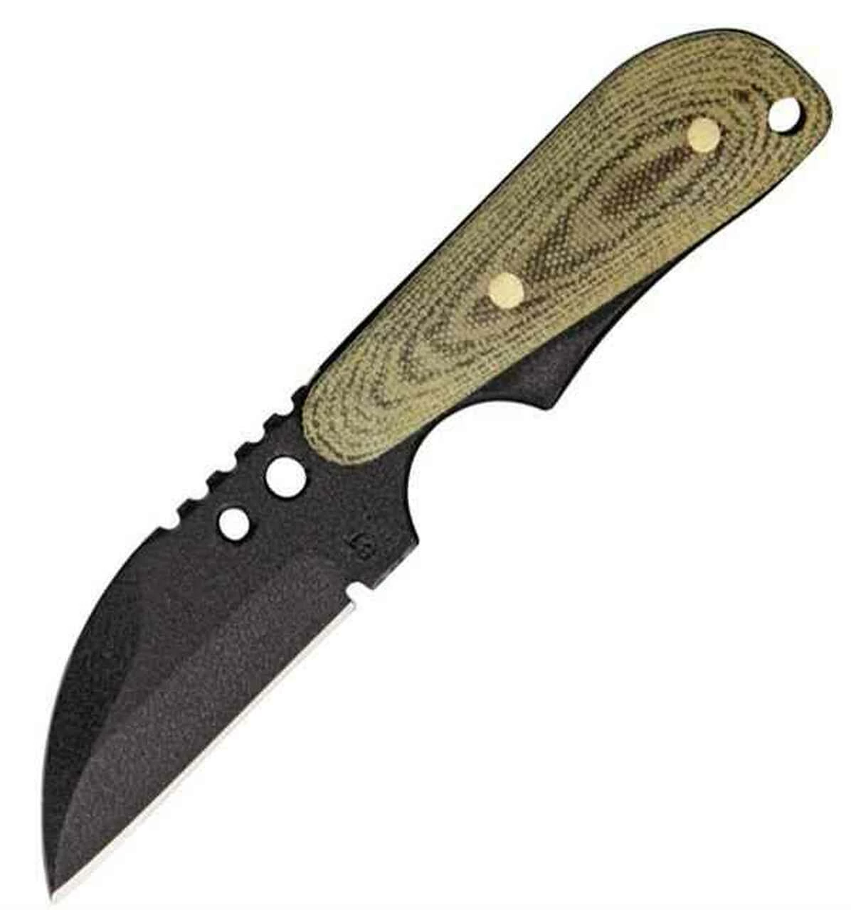 Shadow Tech Raptor 2. 7″ overall. 3 1/4″ 1095 high carbon steel modified wharncliff style blade with black powder coat finish. Blade is sharp on the back side and has extreme point. Full tang. OD green canvas micarta handles. Same style as the popular Talon A, just wider. Molded black Kydex sheath with horizontal, vertical and 45 degree draw option.