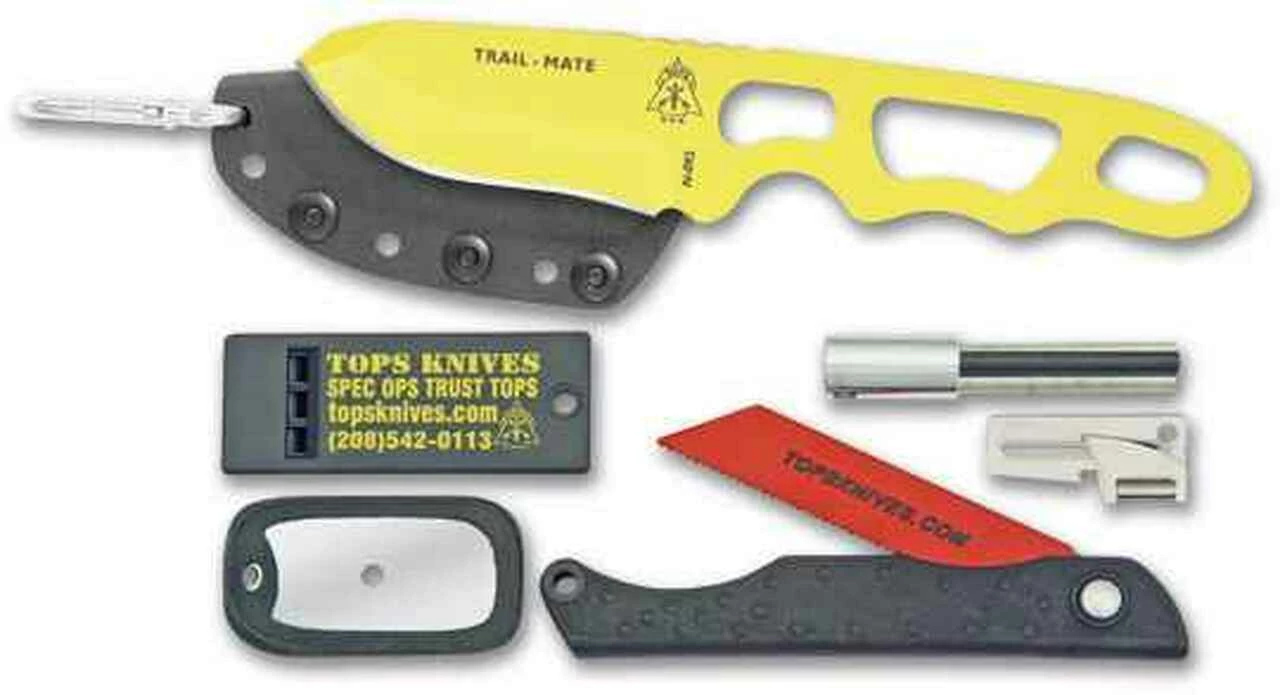 Tops Trail Mate Code Yellow. 6 5/8″ overall. 3″ blade. One piece 1095 carbon steel construction with yellow finish. Skeletonized handle with machined hole cutouts. Black Kydex sheath with carabiner and military ball chain. Kit includes survival saw, emergency whistle, firestarter and signal mirror.
