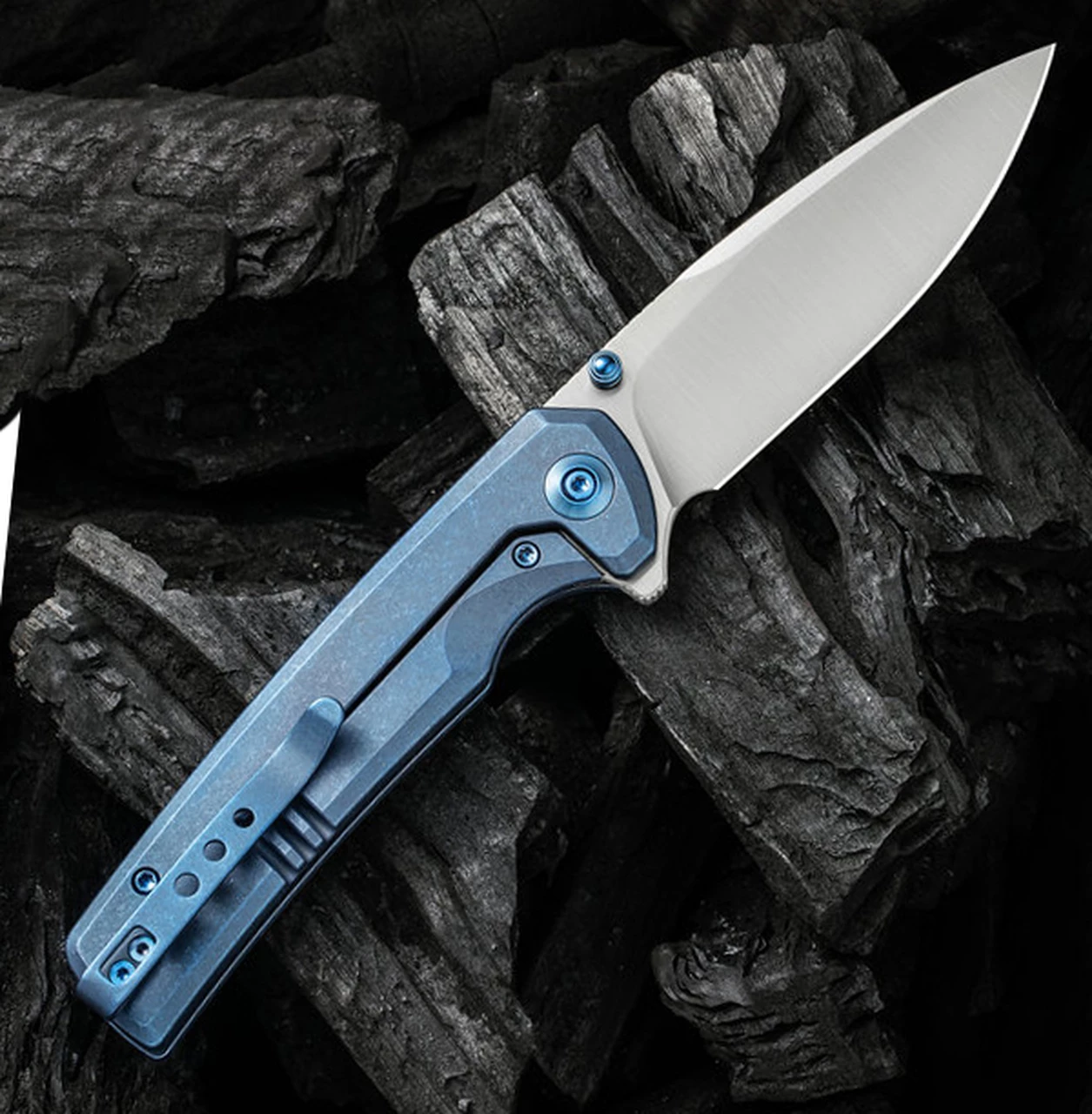 WE Knife Co. Subjugator Frame Lockย (WE 21014C-3) – 3.48″ CPM 20CV Satin Drop Point Blade, Blue Stonewashed Titanium Handle