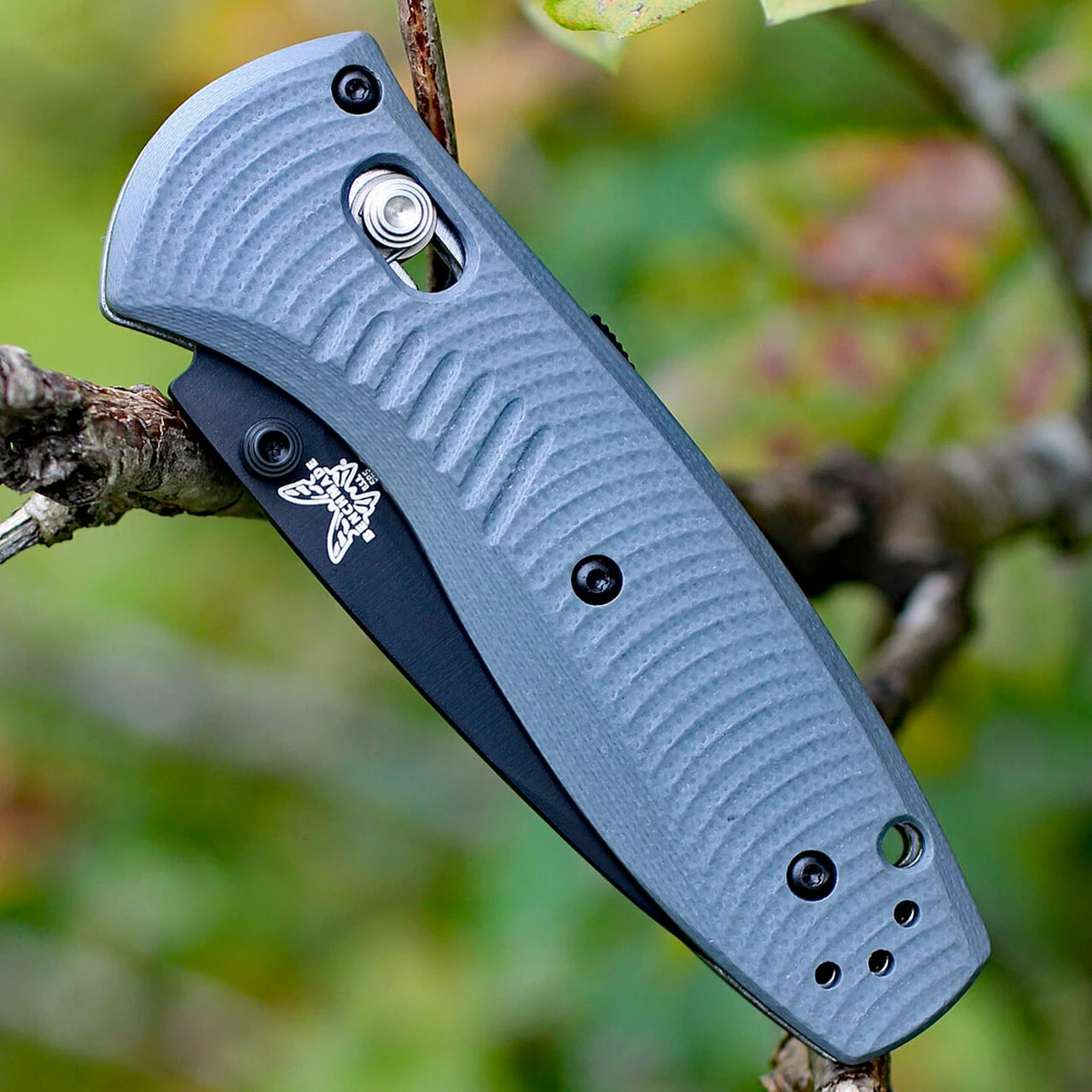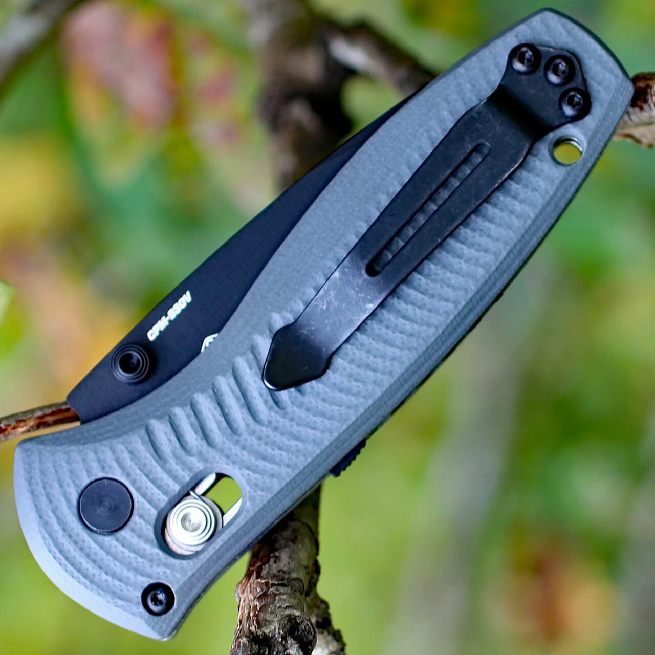 The original AXISAssist now with G10 handles. The Barrage knives were the first folders with both an AXISlock and a spring assist.The AXIS lock is generally considered the strongest locking mechanism available on a folding knife. By adding a spring assist, Benchmade gives the user two great featuresspeed (with the assist), and strength. The Gray G10 enhances the look and feel and upgraded blade steel offers enhanced edge performance. The same awesome mechanism with a new look and feel and a performance upgrade now comes with a black steel backspacer. Whats not to like?
