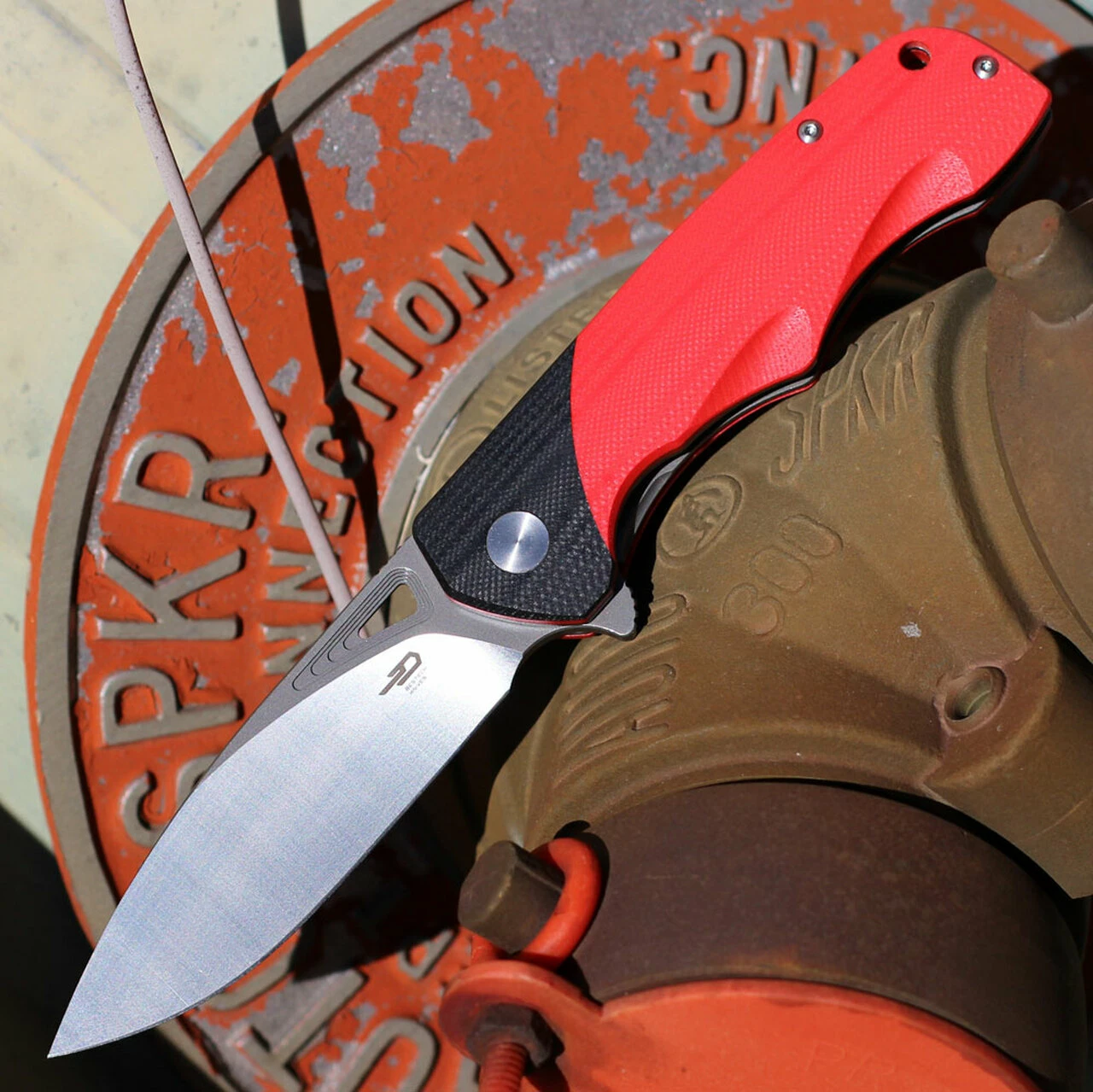 Bestech Airsteam Folding Knife (BG47C) – 3.9″ D2 Two Tone Satin & Gray Drop Point Blade, Red and Black G10 Handle