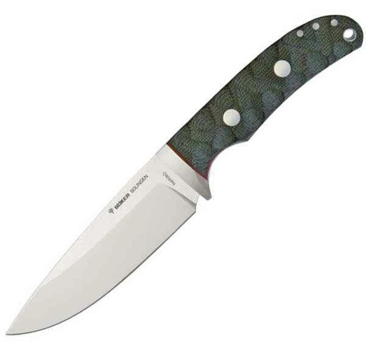 This professional hunting knife and outdoor knife has an impressive blade and elegant flowing lines in its design. The concept of this piece, by Armin Stutz (from the Austrian Knife Forge “Steirer Eisen”), was created due to experiences with big game hunting in Africa and in cooperation with professional rangers, and was approved under these harsh conditions. The massive blade features an attractive two-tone finish, and is made of N690BO steel, which is a special alloy containing cobalt, exclusively created in a collaboration between Austrian steel manufacturer Bohler and Boker. This high performance steel can handle any cutting task, and the full tang design of this piece provides extraordinary strength and stability. The elaborately grooved canvas micarta scales provide not only a characteristic look but also an extremely secure grip, even when wearing gloves or in wet conditions. A red fiber underlay enhances its unique design. Stainless steel bolsters and a lanyard hole complete this high class knife. A reliable and powerful companion for all outdoor activities. High quality leather sheath included.