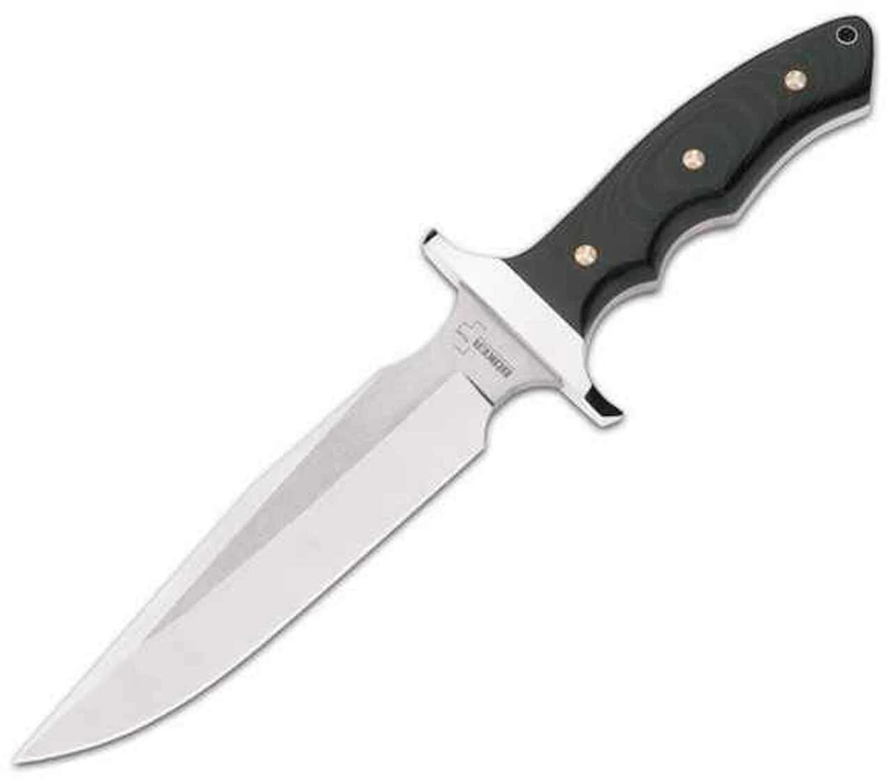 A modern interpretation of the classic Vietnam bowies, from Boker Plus. The blade features a satin finish going off into two different directions (for a two-tone finish), and in impressive thickness of 6mm, and is made of 440C stainless steel with excellent edge-holding capability. The crossguard is made of stainless steel and offers plenty of safety, even under rugged field use. The extensively ground Micarta handles are ergonomically shaped for a comfortable and secure grip, and contain a red fiber layer underneath. The handles are fastened to the tang by the use of mosaic pins, which are ordinarily only seen on custom knives due to costly production, and create a unique appearance. A must-have for the collector! With its approved concept and sturdy dimensions it can also be used as a reliable outdoor knife for a variety of cutting chores. Includes lanyard hole and premium genuine leather sheath.